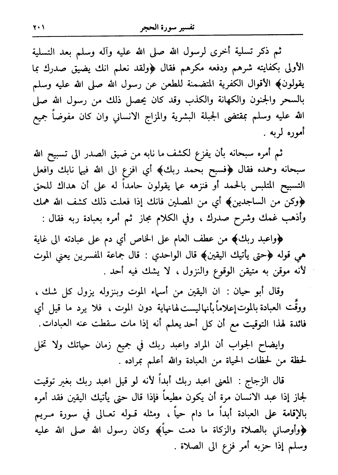 قال الزجاج: المعنى اعبد ربك أبداً لأنه لو قيل أعبد ربك بغير توقيت لجاز إذا عبد الإنسان مرة أن يكون مطيعاً فإذا قال حتى يأتيك اليقين فقد أمره بالإقامة على العبادة أبداً ما دام حياً، ومثله قوله تعالى في سورة مريم (وأوصاني بالصلاة والزكاة ما دمت حياً) وكان رسول الله صلى الله عليه وسلم إذا حزبه أمر فزع إلى الصلاة.