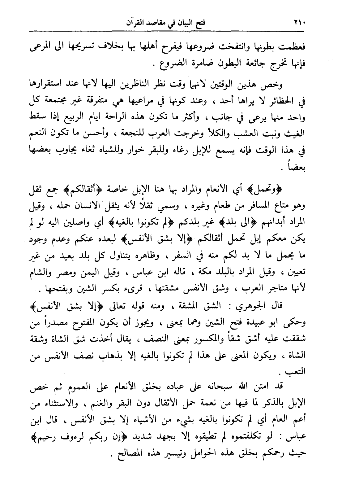 (وتحمل) أي الأنعام والمراد بها هنا الإبل خاصة (أثقالكم) جمع ثقل وهو متاع المسافر من طعام وغيره، وسمي ثقلاً لأنه يثقل الإنسان حمله، وقيل المراد أبدانهم (إلى بلد) غير بلدكم (لم تكونوا بالغيه) أي واصلين إليه لو لم يكن معكم إبل تحمل أثقالكم (إلا بشق الأنفس) لبعده عنكم وعدم وجود ما يحمل ما لا بد لكم منه في السفر، وظاهره يتناول كل بلد بعيد من غير تعيين، وقيل المراد بالبلد مكة، قاله ابن عباس، وقيل اليمن ومصر والشام لأنها متاجر العرب، وشق الأنفس مشقتها، قرئ بكسر الشين وبفتحها.