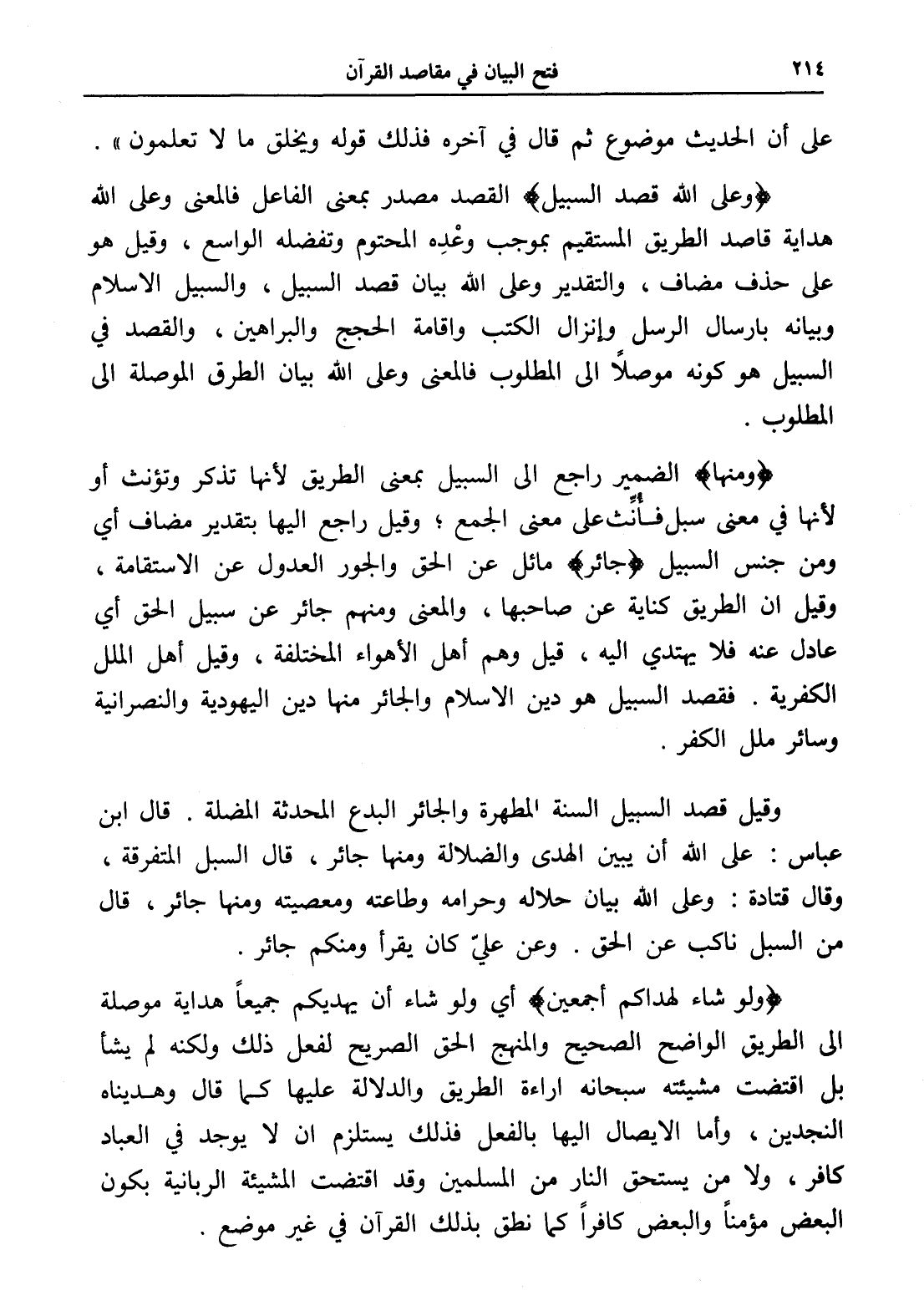 (وعلى الله قصد السبيل) القصد مصدر بمعنى الفاعل فالمعنى وعلى الله هداية قاصد الطريق المستقيم بموجب وعْدِه المحتوم وتفضله الواسع، وقيل هو على حذف مضاف، والتقدير وعلى الله بيان قصد السبيل، والسبيل الإسلام وبيانه بإرسال الرسل وإنزال الكتب وإقامة الحجج والبراهين، والقصد في السبيل هو كونه موصلاً إلى المطلوب فالمعنى وعلى الله بيان الطرق الموصلة إلى المطلوب.