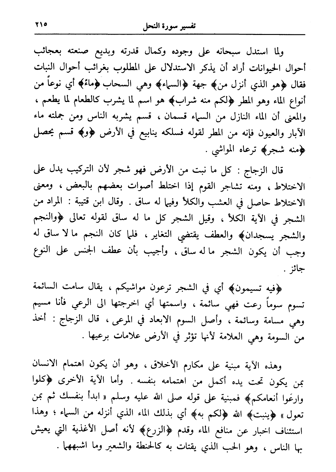 (هو الذي أنزل من) جهة (السماء) وهي السحاب (ماءً) أي نوعاً من أنواع الماء وهو المطر (لكم منه شراب) هو اسم لما يشرب كالطعام لما يطعم، والمعنى أن الماء النازل من السماء قسمان، قسم يشربه الناس ومن جملته ماء الآبار والعيون فإنه من المطر لقوله فسلكه ينابيع في الأرض (و) قسم يحصل (منه شجر) ترعاه المواشي.