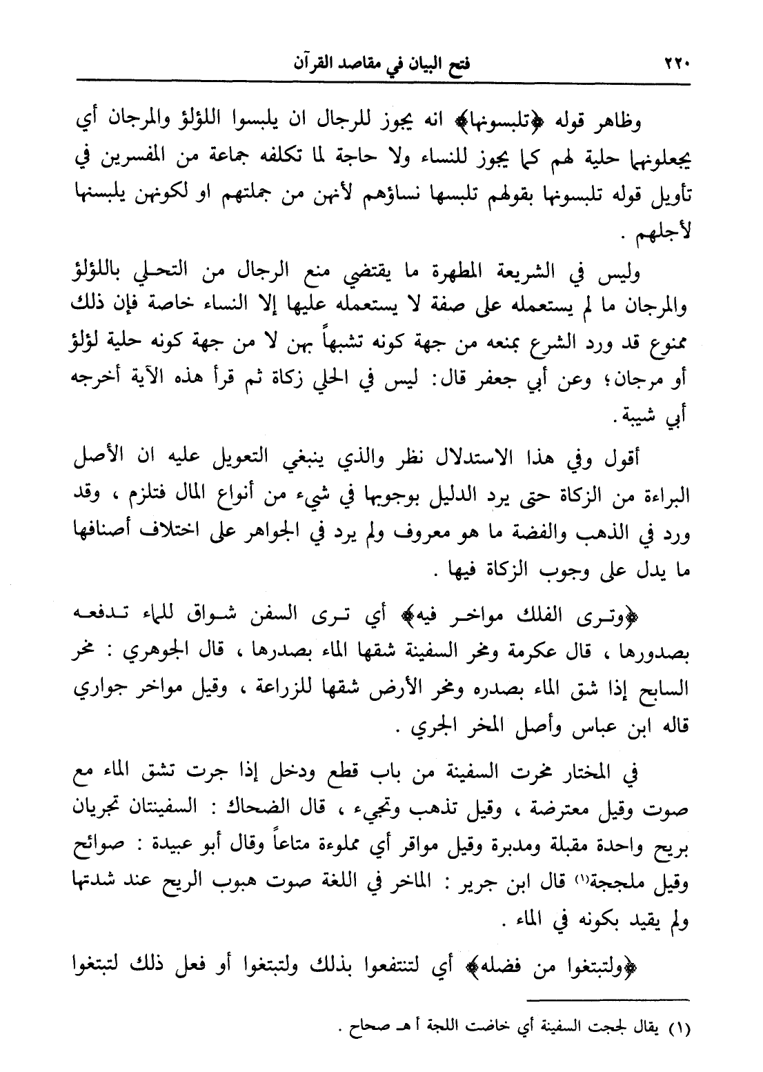 وليس في الشريعة المطهرة ما يقتضي منع الرجال من التحلي باللؤلؤ والمرجان ما لم يستعمله على صفة لا يستعمله عليها إلا النساء خاصة فإن ذلك ممنوع قد ورد الشرع بمنعه من جهة كونه تشبهاً بهن لا من جهة كونه حلية لؤلؤ أو مرجان؛ وعن أبي جعفر قال: ليس في الحلي زكاة ثم قرأ هذه الآية أخرجه أبي شيبة.