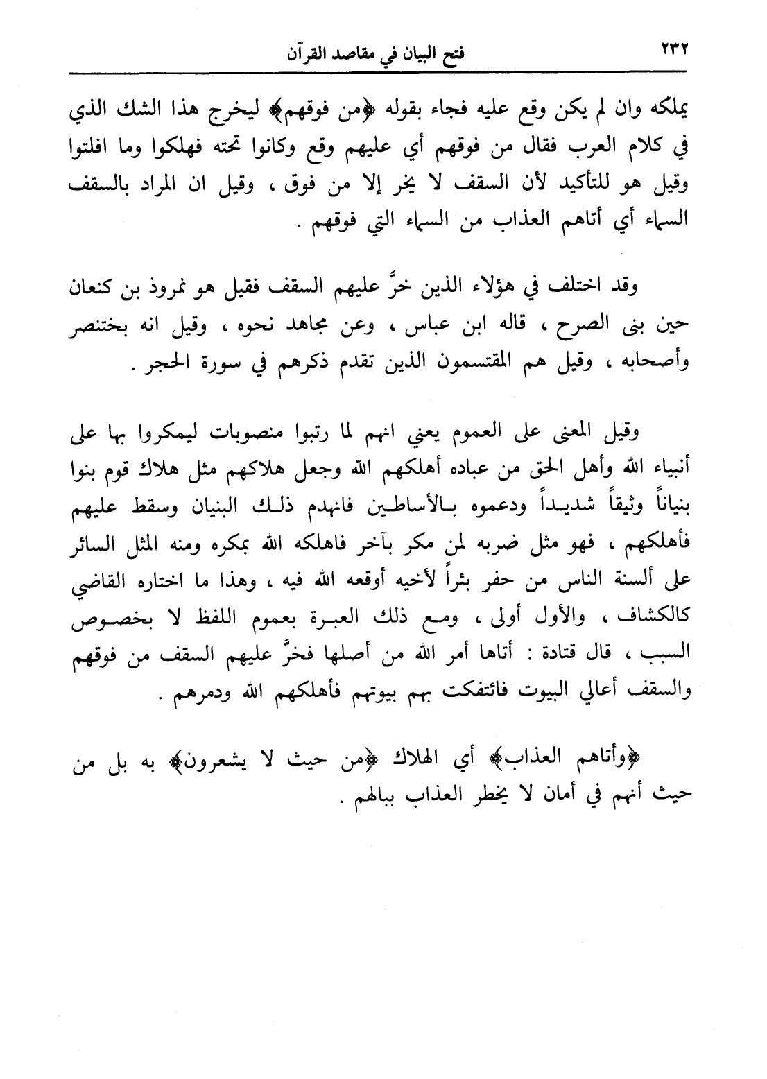 يملكه وإن لم يكن وقع عليه فجاء بقوله (من فوقهم) ليخرج هذا الشك الذي في كلام العرب فقال من فوقهم أي عليهم وقع وكانوا تحته فهلكوا وما افلتوا وقيل هو للتأكيد لأن السقف لا يخر إلا من فوق، وقيل أن المراد بالسقف السماء أي أتاهم العذاب من السماء التي فوقهم.