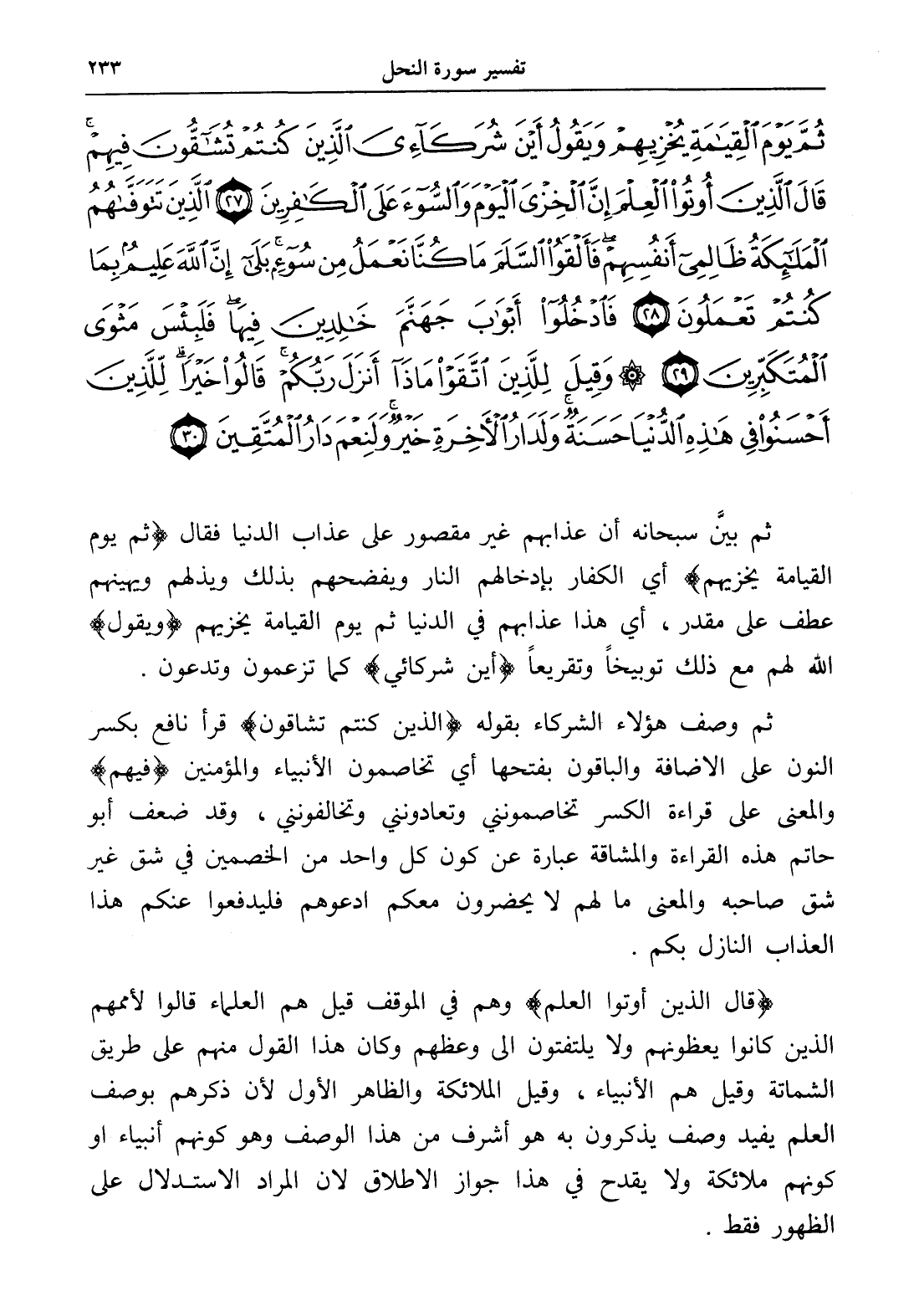 ثُمَّ يَوْمَ الْقِيَامَةِ يُخْزِيهِمْ وَيَقُولُ أَيْنَ شُرَكَائِيَ الَّذِينَ كُنْتُمْ تُشَاقُّونَ فِيهِمْ قَالَ الَّذِينَ أُوتُوا الْعِلْمَ إِنَّ الْخِزْيَ الْيَوْمَ وَالسُّوءَ عَلَى الْكَافِرِينَ (27) الَّذِينَ تَتَوَفَّاهُمُ الْمَلَائِكَةُ ظَالِمِي أَنْفُسِهِمْ فَأَلْقَوُا السَّلَمَ مَا كُنَّا نَعْمَلُ مِنْ سُوءٍ بَلَى إِنَّ اللَّهَ عَلِيمٌ بِمَا كُنْتُمْ تَعْمَلُونَ (28) فَادْخُلُوا أَبْوَابَ جَهَنَّمَ خَالِدِينَ فِيهَا فَلَبِئْسَ مَثْوَى الْمُتَكَبِّرِينَ (29) وَقِيلَ لِلَّذِينَ اتَّقَوْا مَاذَا أَنْزَلَ رَبُّكُمْ قَالُوا خَيْرًا لِلَّذِينَ أَحْسَنُوا فِي هَذِهِ الدُّنْيَا حَسَنَةٌ وَلَدَارُ الْآخِرَةِ خَيْرٌ وَلَنِعْمَ دَارُ الْمُتَّقِينَ (30)