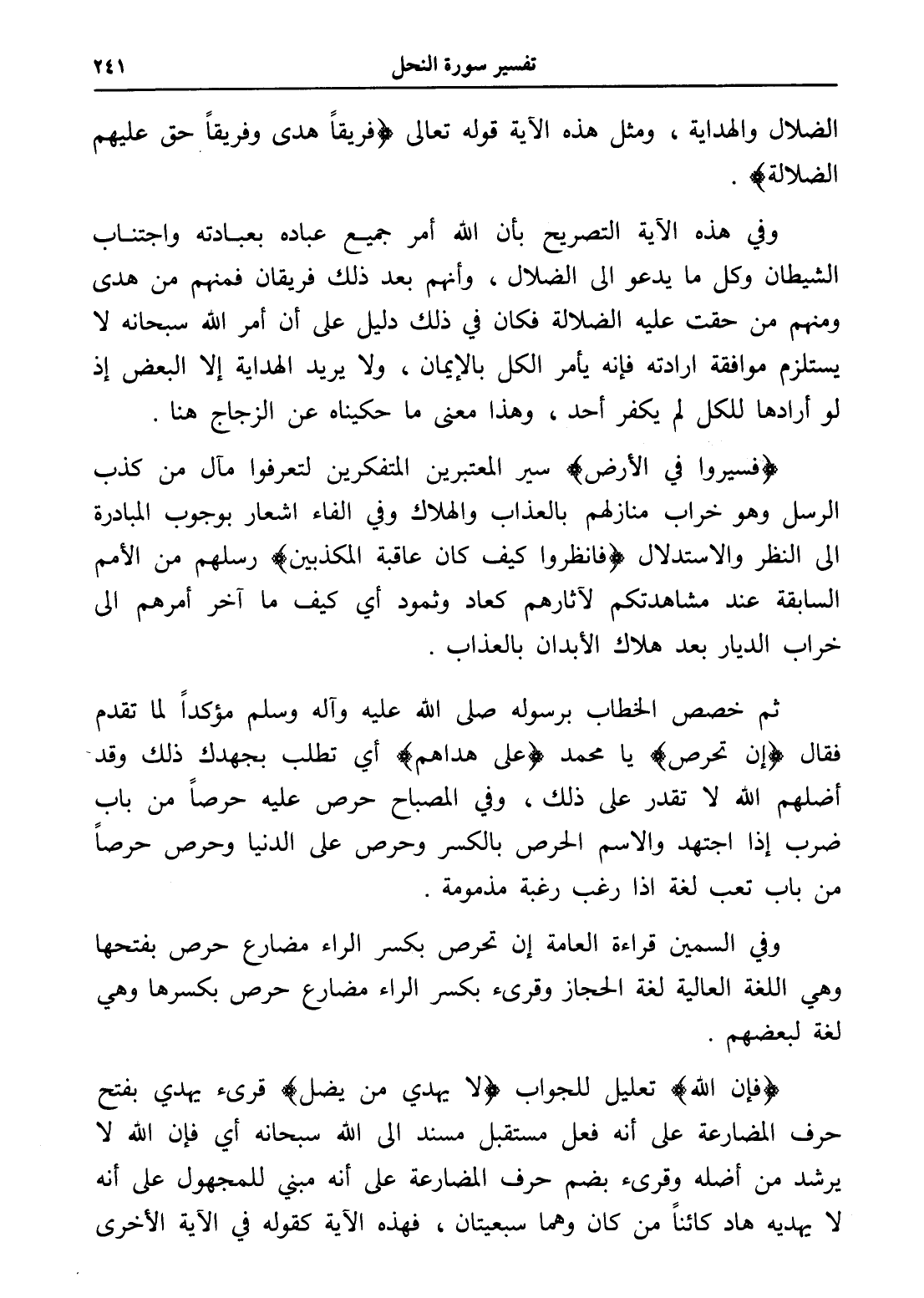 وفي هذه الآية التصريح بأن الله أمر جميع عباده بعبادته واجتناب الشيطان وكل ما يدعو إلى الضلال، وأنهم بعد ذلك فريقان فمنهم من هدى ومنهم من حقت عليه الضلالة فكان في ذلك دليل على أن أمر الله سبحانه لا يستلزم موافقة إرادته فإنه يأمر الكل بالإيمان، ولا يريد الهداية إلا البعض إذ لو أرادها للكل لم يكفر أحد، وهذا معنى ما حكيناه عن الزجاج هنا.