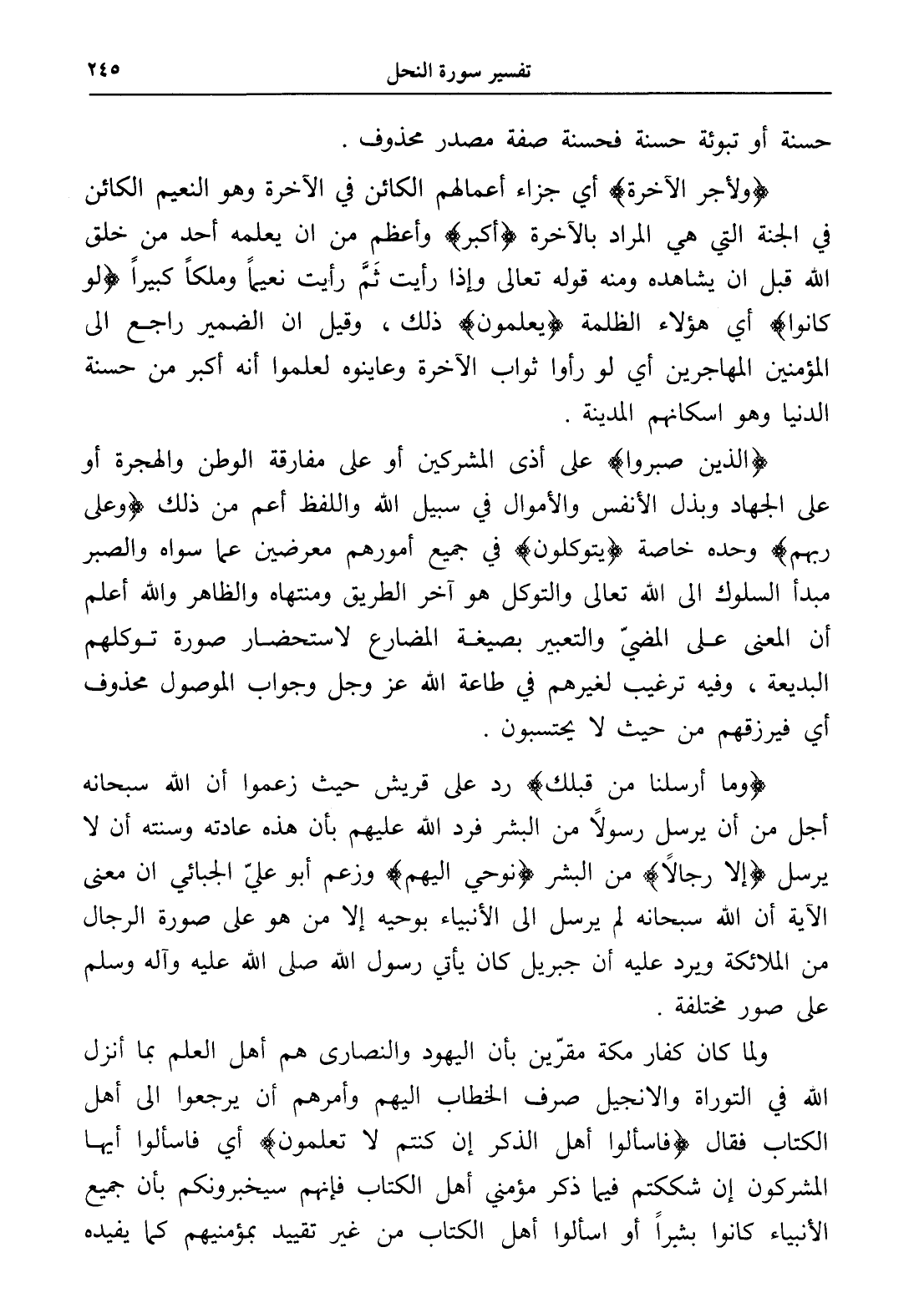 (ولأجر الآخرة) أي جزاء أعمالهم الكائن في الآخرة وهو النعيم الكائن في الجنة التي هي المراد بالآخرة (أكبر) وأعظم من أن يعلمه أحد من خلق الله قبل أن يشاهده ومنه قوله تعالى وإذا رأيت ثَمَّ رأيت نعيماً وملكاً كبيراً (لو كانوا) أي هؤلاء الظلمة (يعلمون) ذلك، وقيل أن الضمير راجع إلى المؤمنين المهاجرين أي لو رأوا ثواب الآخرة وعاينوه لعلموا أنه أكبر من حسنة الدنيا وهو إسكانهم المدينة.