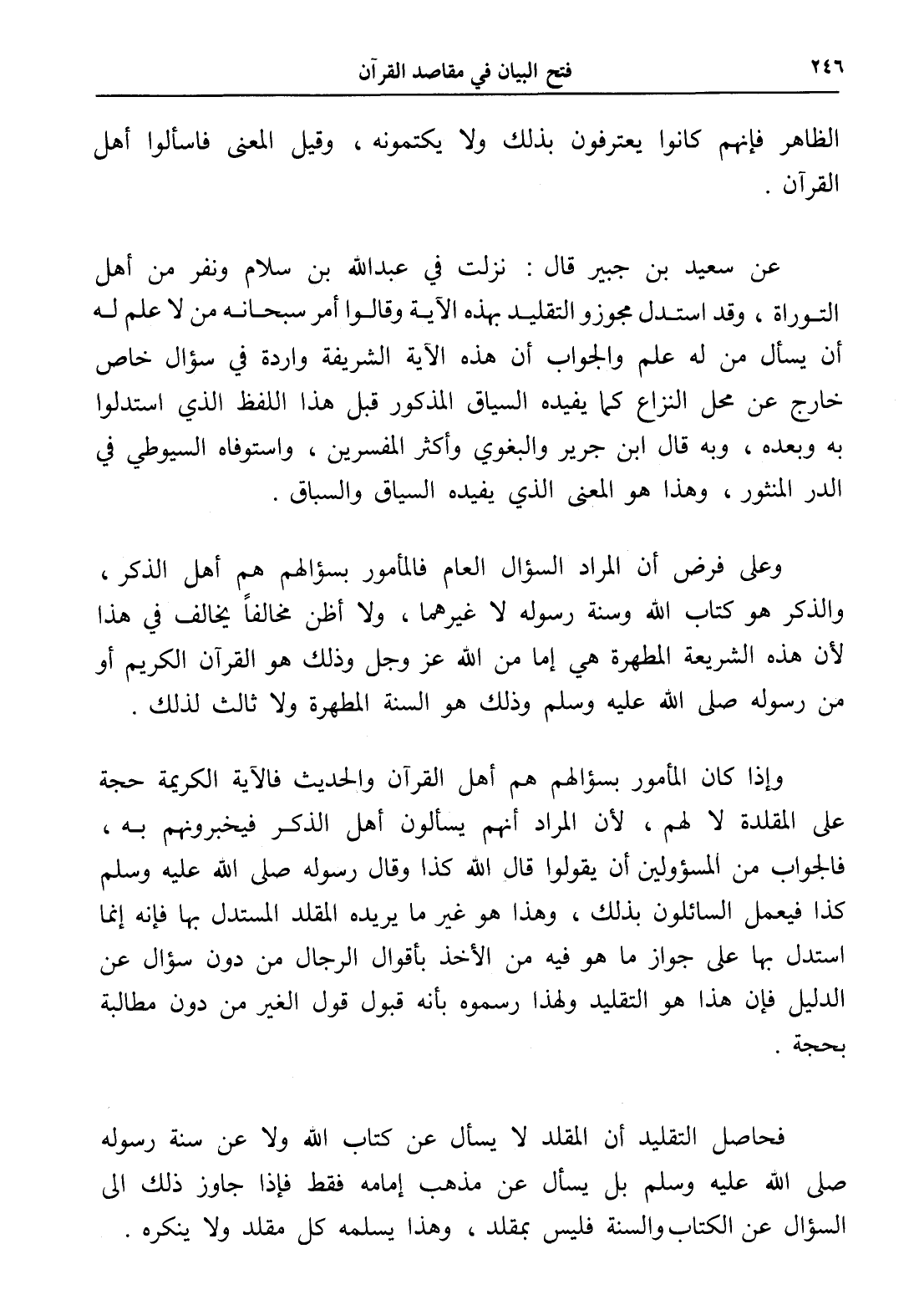 وإذا كان المأمور بسؤالهم هم أهل القرآن والحديث فالآية الكريمة حجة على المقلدة لا لهم، لأن المراد أنهم يسألون أهل الذكر فيخبرونهم به، فالجواب من المسؤولين أن يقولوا قال الله كذا وقال رسوله صلى الله عليه وسلم كذا فيعمل السائلون بذلك، وهذا هو غير ما يريده المقلد المستدل بها فإنه إنما استدل بها على جواز ما هو فيه من الأخذ بأقوال الرجال من دون سؤال عن الدليل فإن هذا هو التقليد ولهذا رسموه بأنه قبول قول الغير من دون مطالبة بحجه.