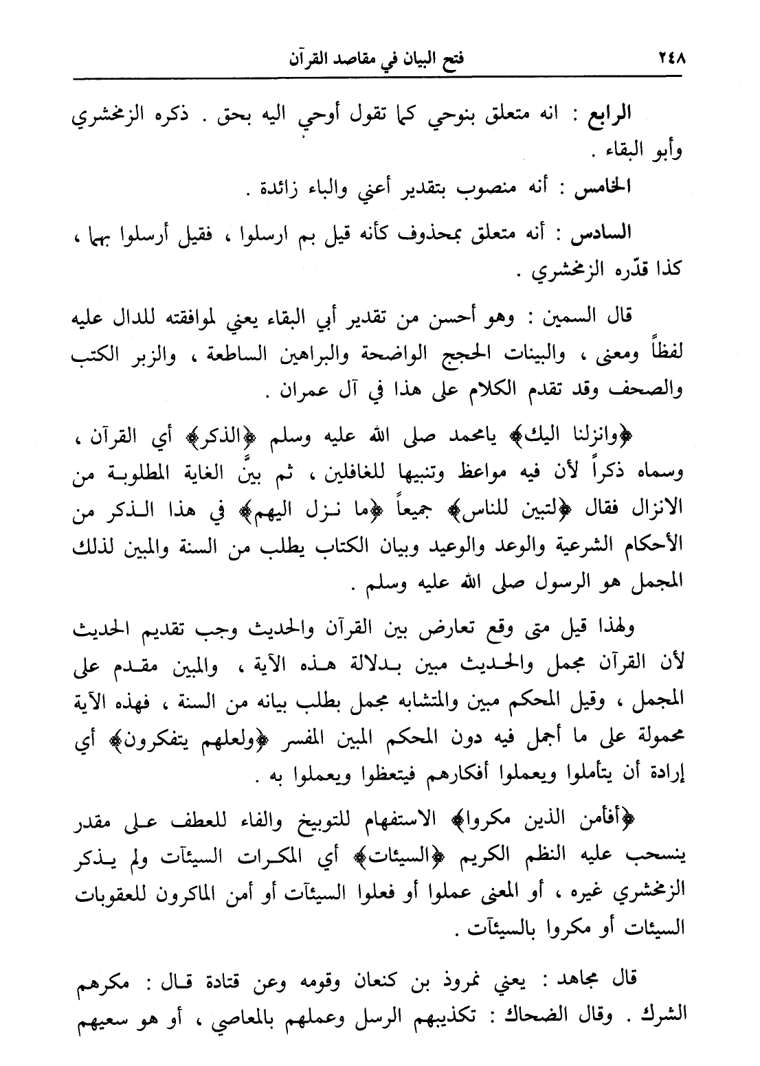 الرابع: أنه متعلق بنوحي كما تقول أوحي إليه بحق. ذكره الزمخشري وأبو البقاء.