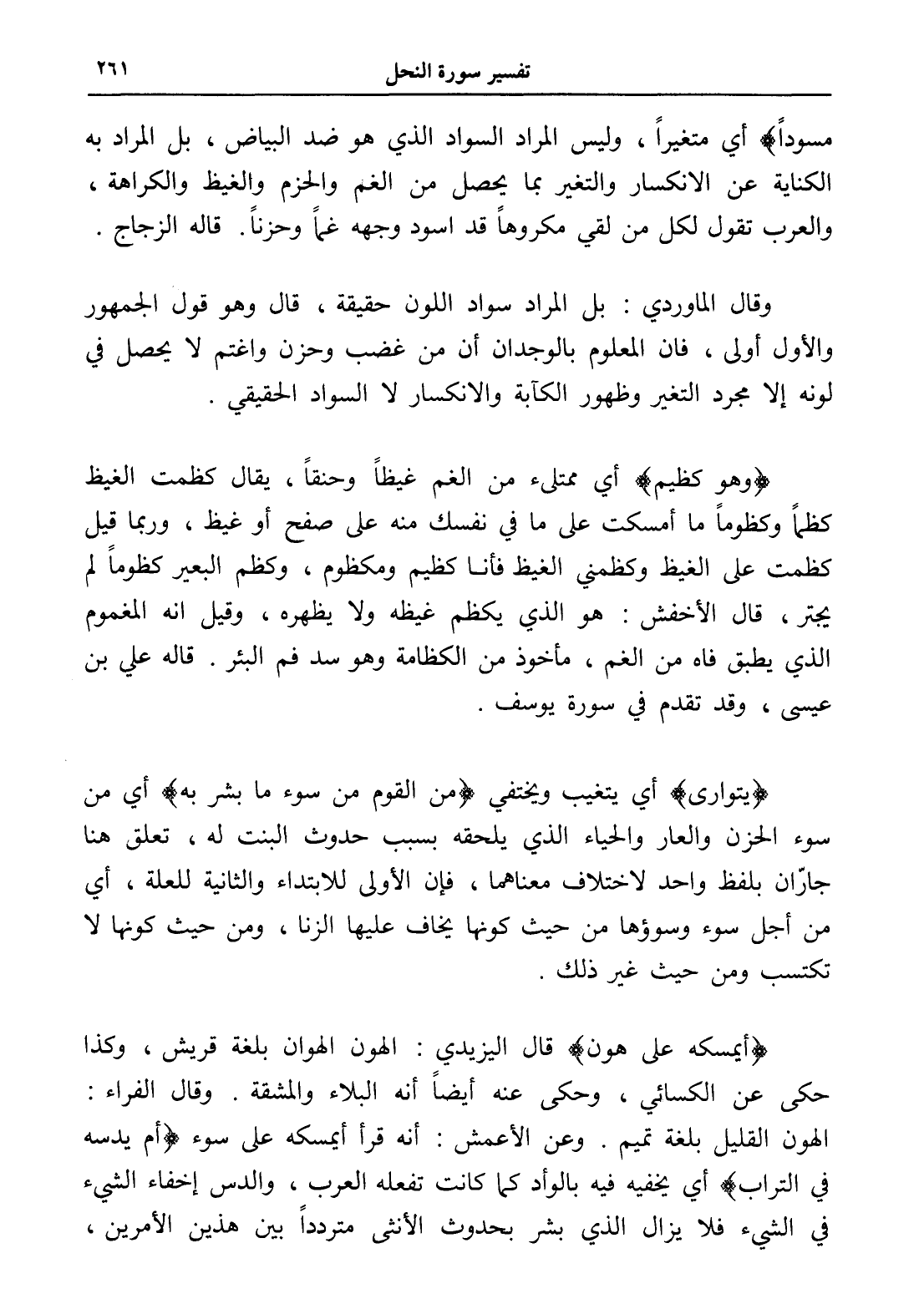 وقال الماوردي: بل المراد سواد اللون حقيقة، قال وهو قول الجمهور والأول أولى، فإن المعلوم بالوجدان أن من غضب وحزن واغتم لا يحصل في لونه إلا مجرد التغير وظهور الكآبة والانكسار لا السواد الحقيقي.