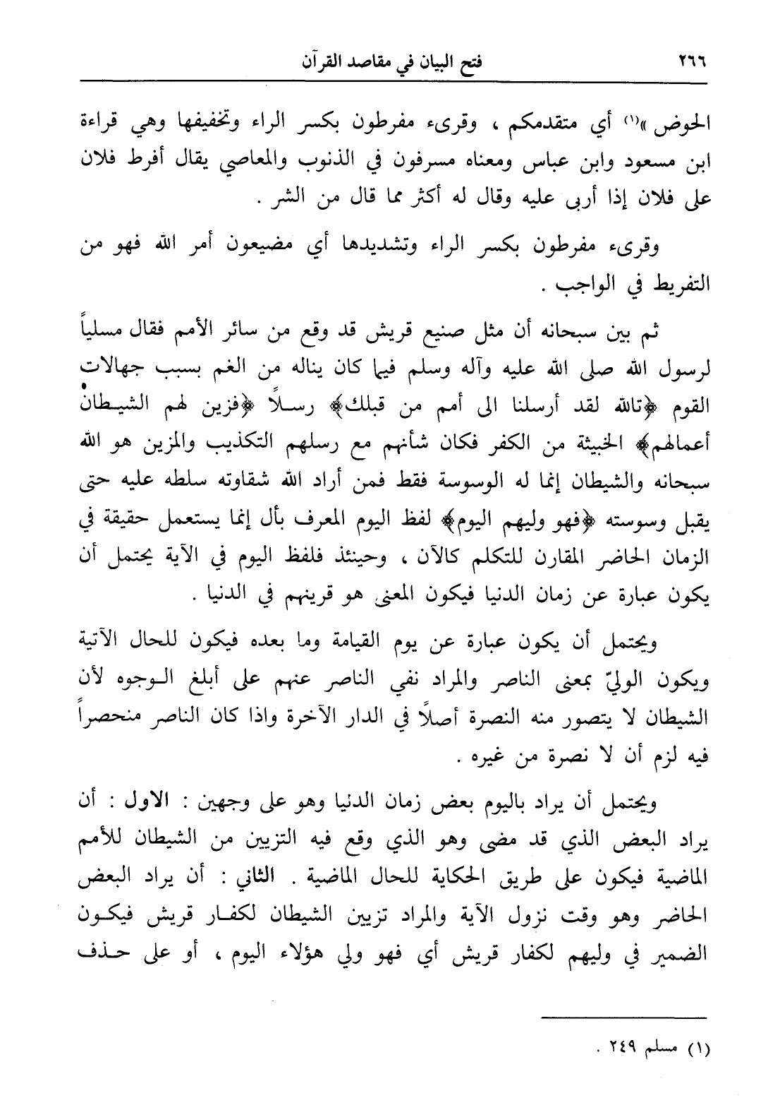 الحوض " (¬1) أي متقدمكم، وقرئ مفرطون بكسر الراء وتخفيفها وهي قراءة ابن مسعود وابن عباس ومعناه مسرفون في الذنوب والمعاصي يقال أفرط فلان على فلان إذا أربى عليه وقال له أكثر مما قال من الشر.
