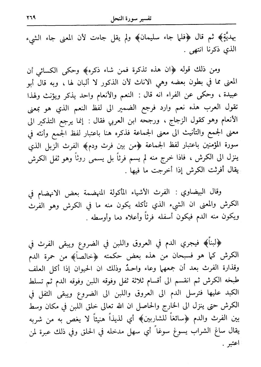 ومن ذلك قوله (إن هذه تذكرة فمن شاء ذكره) وحكى الكسائي أن المعنى مما في بطون بعضه وهي الإناث لأن الذكور لا ألبان لها، وبه قال أبو عبيدة، وحكى عن الفراء أنه قال: النعم والإنعام واحد يذكر ويؤنث ولهذا تقول العرب هذه نعم وارد فرجع الضمير إلى لفظ النعم الذي هو بمعنى الإنعام وهو كقول الزجاج، ورجحه ابن العربي فقال: إنما يرجع التذكير إلى معنى الجمع والتأنيث إلى معنى الجماعة فذكره هنا باعتبار لفظ الجمع وأنثه في سورة المؤمنين باعتبار لفظ الجماعة (من بين فرث ودم) الفرث الزبل الذي ينزل إلى الكرش، فإذا خرج منه لم يسم فرثاً بل يسمى روقاً وهو ثفل الكرش يقال أفرثت الكرش إذا أخرجت ما فيها.