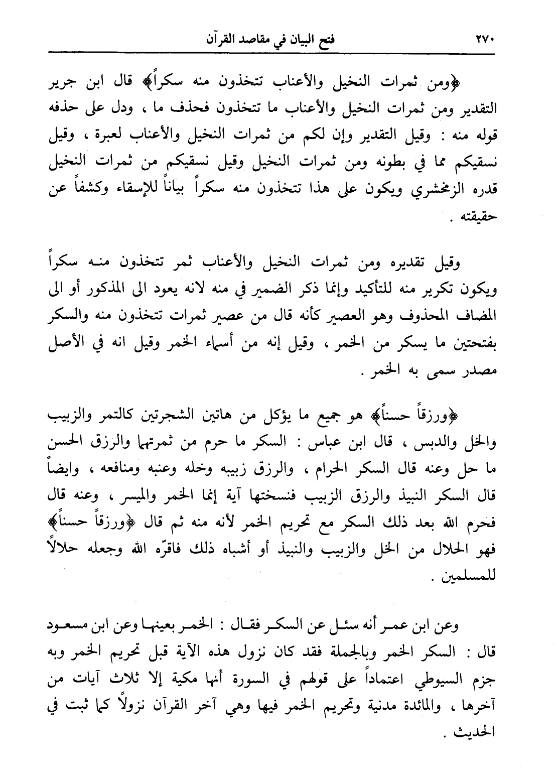 (ورزقاً حسناً) هو جميع ما يؤكل من هاتين الشجرتين كالتمر والزبيب والخل والدبس، قال ابن عباس: السكر ما حرم من ثمرتهما والرزق الحسن ما حل وعنه قال السكر الحرام، والرزق زبيبه وخله وعنبه ومنافعه، وأيضاً قال السكر النبيذ والرزق الزبيب فنسختها آية إنما الخمر والميسر، وعنه قال فحرم الله بعد ذلك السكر مع تحريم الخمر لأنه منه ثم قال (ورزقاً حسناً) فهو الحلال من الخل والزبيب والنبيذ أو أشباه ذلك فأقرّه الله وجعله حلالاً للمسلمين.