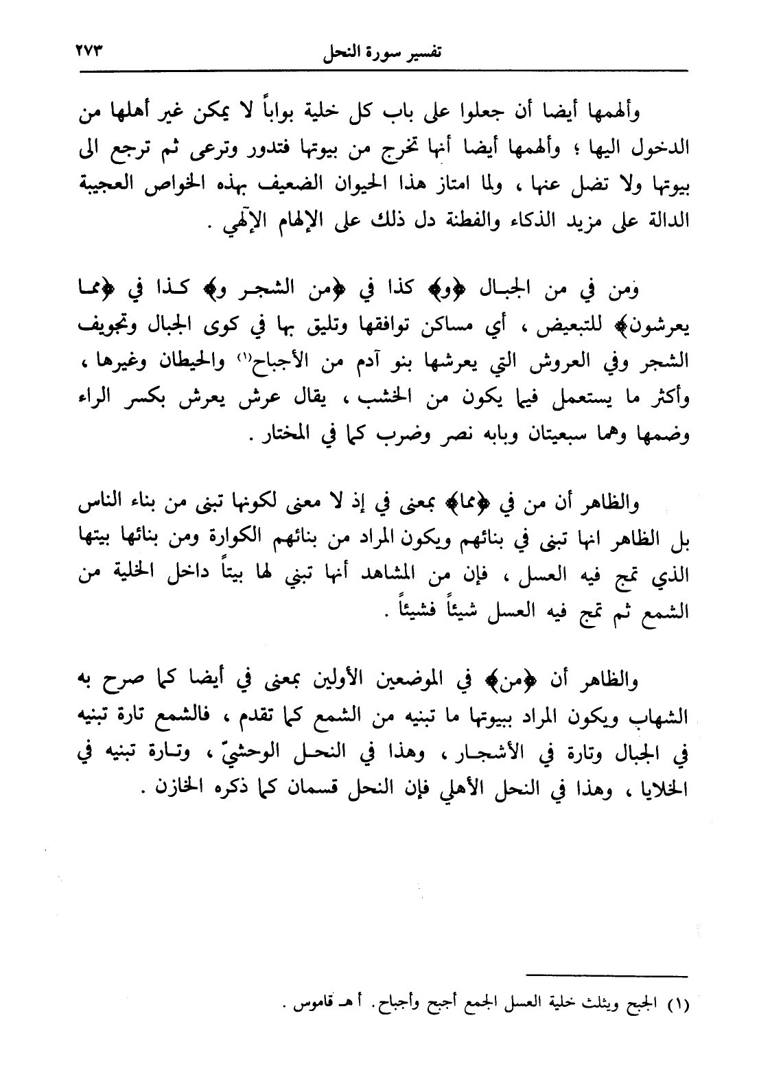 والظاهر أن (من) في الموضعين الأولين بمعنى في أيضًا كما صرح به الشهاب ويكون المراد ببيوتها ما تبنيه من الشمع كما تقدم، فالشمع تارة تبنيه في الجبال وتارة في الأشجار، وهذا في النحل الوحشيّ، وتارة تبنيه في الخلايا، وهذا في النحل الأهلي فإن النحل قسمان كما ذكره الخازن.