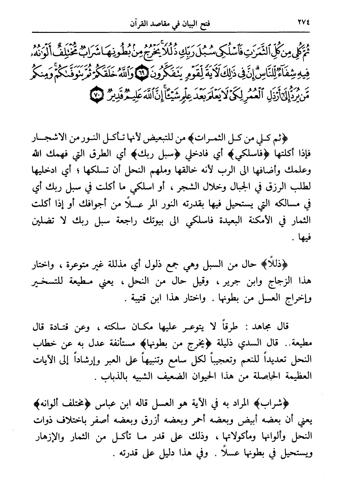 ثُمَّ كُلِي مِنْ كُلِّ الثَّمَرَاتِ فَاسْلُكِي سُبُلَ رَبِّكِ ذُلُلًا يَخْرُجُ مِنْ بُطُونِهَا شَرَابٌ مُخْتَلِفٌ أَلْوَانُهُ فِيهِ شِفَاءٌ لِلنَّاسِ إِنَّ فِي ذَلِكَ لَآيَةً لِقَوْمٍ يَتَفَكَّرُونَ (69) وَاللَّهُ خَلَقَكُمْ ثُمَّ يَتَوَفَّاكُمْ وَمِنْكُمْ مَنْ يُرَدُّ إِلَى أَرْذَلِ الْعُمُرِ لِكَيْ لَا يَعْلَمَ بَعْدَ عِلْمٍ شَيْئًا إِنَّ اللَّهَ عَلِيمٌ قَدِيرٌ (70)
