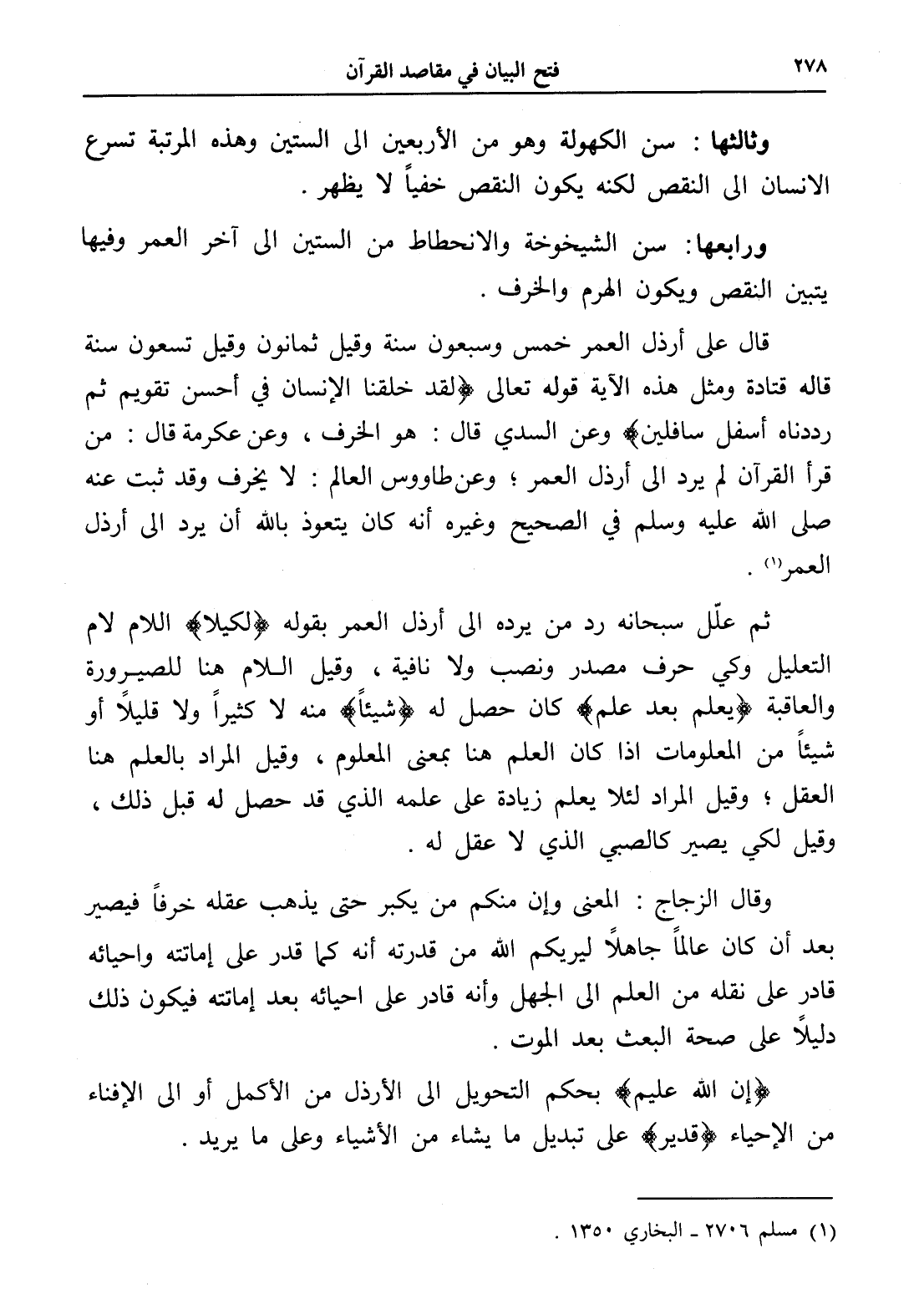 قال على أرذل العمر خمس وسبعون سنة وقيل ثمانون وقيل تسعون سنة قاله قتادة ومثل هذه الآية قوله تعالى (لقد خلقنا الإنسان في أحسن تقويم ثم رددناه أسفل سافلين) وعن السدي قال: هو الخرف، وعن عكرمة قال: من قرأ القرآن لم يرد إلى أرذل العمر؛ وعن طاووس العالم: لا يخرف وقد ثبت عنه صلى الله عليه وسلم في الصحيح وغيره أنه كان يتعوذ بالله أن يرد إلى أرذل العمر (¬1).