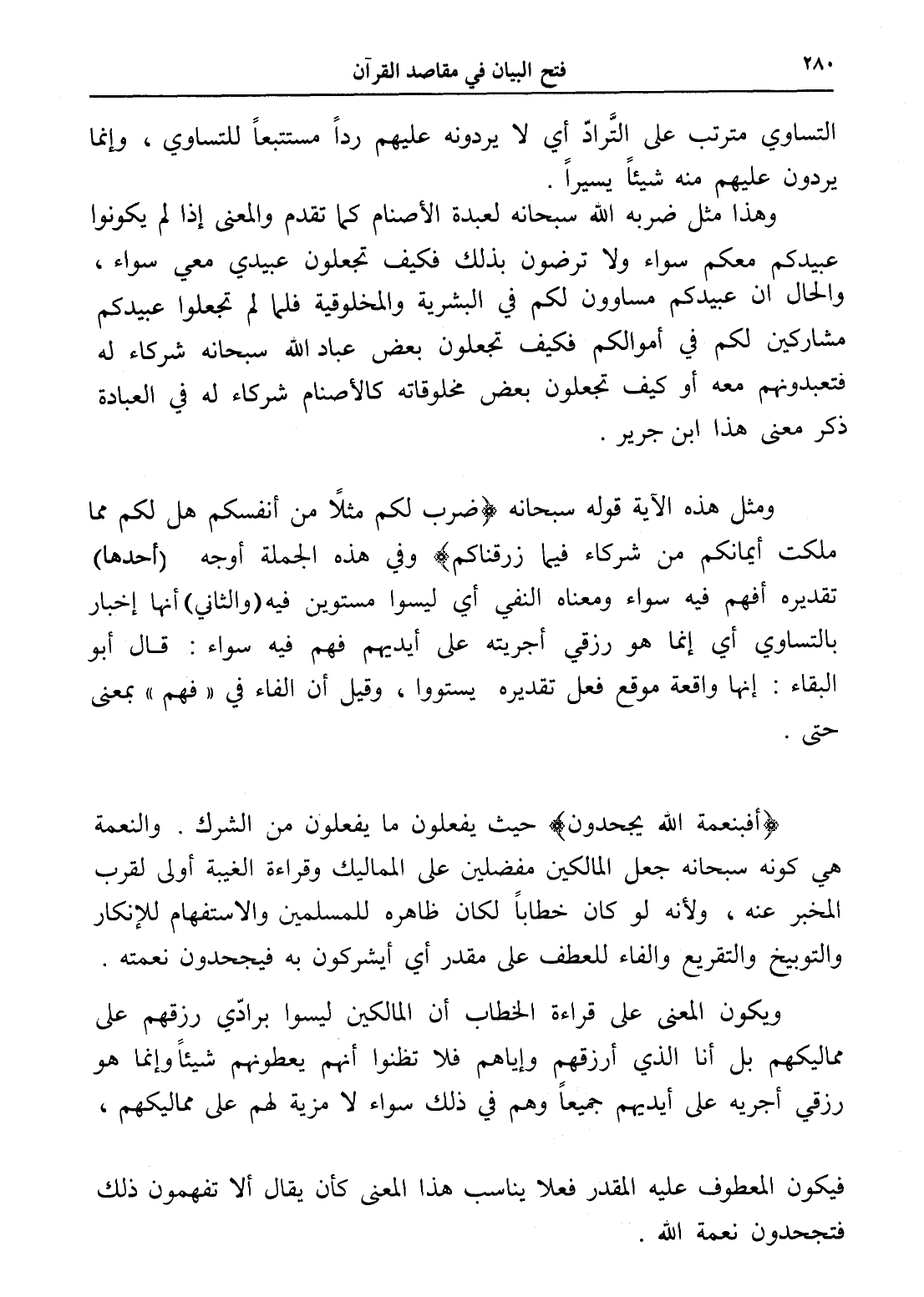 ومثل هذه الآية قوله سبحانه (ضرب لكم مثلاً من أنفسكم هل لكم مما ملكت أيمانكم من شركاء فيما زرقناكم) وفي هذه الجملة أوجه (أحدها) تقديره أفهم فيه سواء ومعناه النفي أي ليسوا مستوين فيه (والثاني) أنها إخبار بالتساوي أي إنما هو رزقي أجريته على أيديهم فهم فيه سواء: قال أبو البقاء: إنها واقعة موقع فعل تقديره يستووا، وقيل أن الفاء في " فهم " بمعنى حتى.