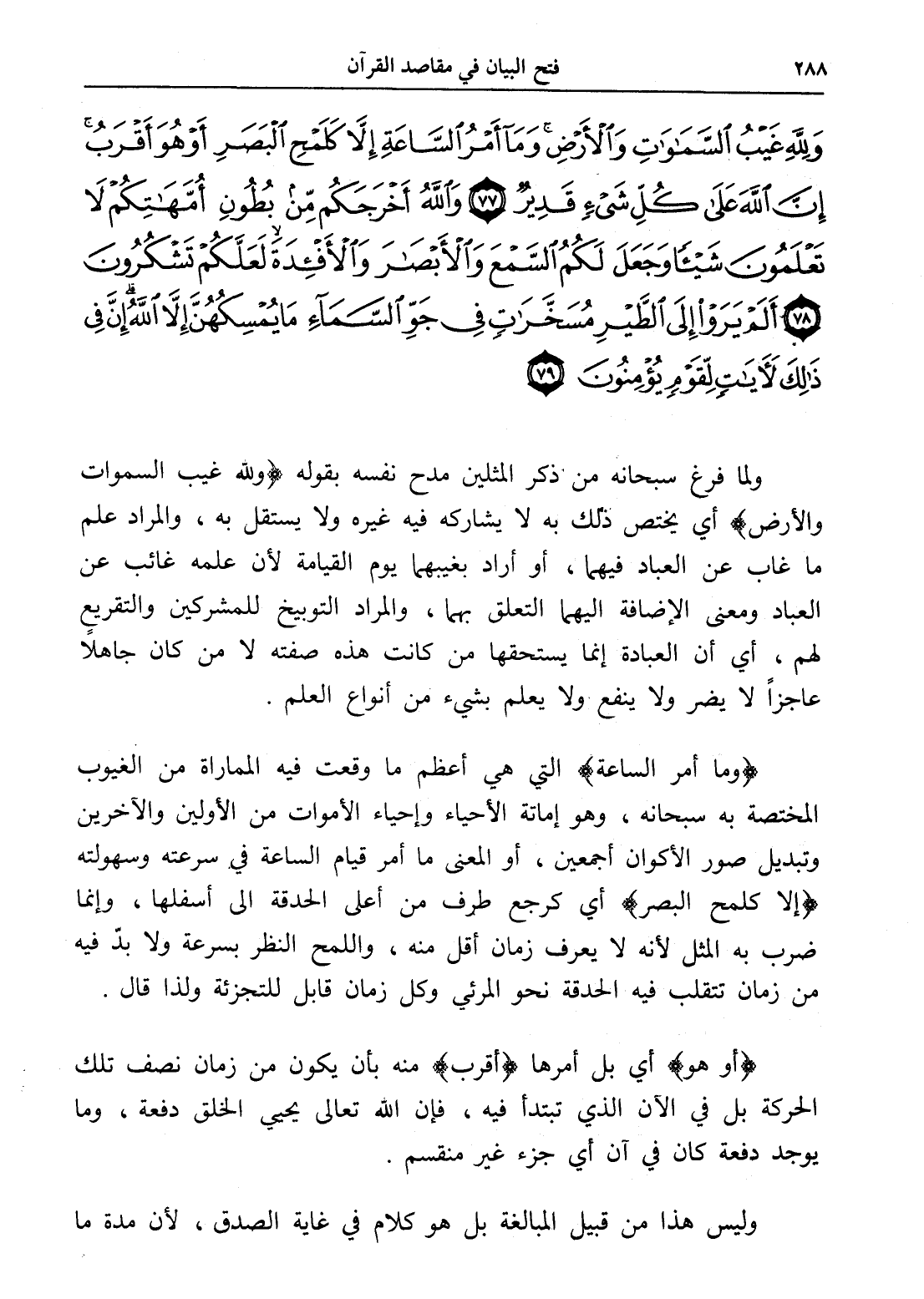 وَلِلَّهِ غَيْبُ السَّمَاوَاتِ وَالْأَرْضِ وَمَا أَمْرُ السَّاعَةِ إِلَّا كَلَمْحِ الْبَصَرِ أَوْ هُوَ أَقْرَبُ إِنَّ اللَّهَ عَلَى كُلِّ شَيْءٍ قَدِيرٌ (77) وَاللَّهُ أَخْرَجَكُمْ مِنْ بُطُونِ أُمَّهَاتِكُمْ لَا تَعْلَمُونَ شَيْئًا وَجَعَلَ لَكُمُ السَّمْعَ وَالْأَبْصَارَ وَالْأَفْئِدَةَ لَعَلَّكُمْ تَشْكُرُونَ (78) أَلَمْ يَرَوْا إِلَى الطَّيْرِ مُسَخَّرَاتٍ فِي جَوِّ السَّمَاءِ مَا يُمْسِكُهُنَّ إِلَّا اللَّهُ إِنَّ فِي ذَلِكَ لَآيَاتٍ لِقَوْمٍ يُؤْمِنُونَ (79)