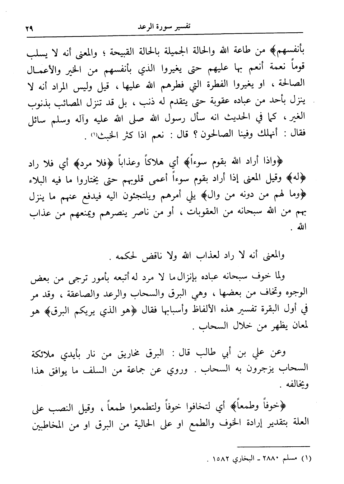 بأنفسهم) من طاعة الله والحالة الجميلة بالحالة القبيحة؛ والمعنى أنه لا يسلب قوماً نعمة أنعم بها عليهم حتى يغيروا الذي بأنفسهم من الخير والأعمال الصالحة، أو يغيروا الفطرة التي فطرهم الله عليها، قيل وليس المراد أنه لا ينزل بأحد من عباده عقوبة حتى يتقدم له ذنب، بل قد تنزل المصائب بذنوب الغير، كما في الحديث أنه سأل رسول الله صلى الله عليه وآله وسلم سائل فقال: أنهلك وفينا الصالحون؟ قال: نعم إذا كثر الخبث (¬1).