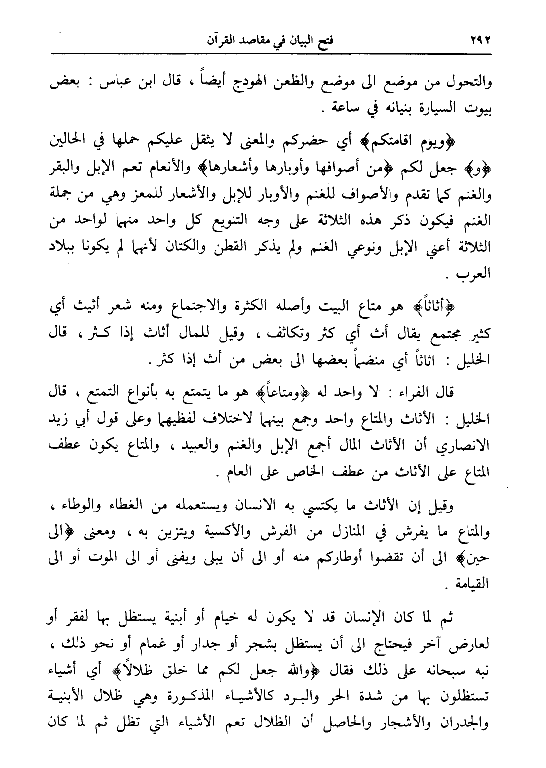 وقيل أن الأثاث ما يكتسي به الإنسان ويستعمله من الغطاء والوطاء، والمتاع ما يفرش في المنازل من الفرش والأكسية ويتزين به، ومعنى (إلى حين) إلى أن تقضوا أوطاركم منه أو إلى أن يبلى ويفنى أو إلى الموت أو إلى القيامة.
