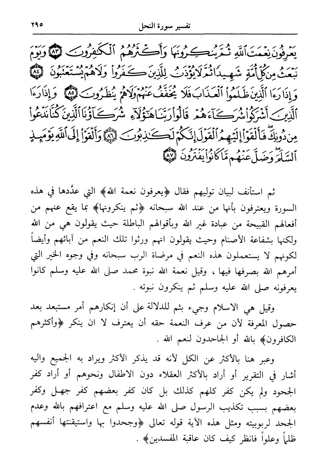 يَعْرِفُونَ نِعْمَتَ اللَّهِ ثُمَّ يُنْكِرُونَهَا وَأَكْثَرُهُمُ الْكَافِرُونَ (83) وَيَوْمَ نَبْعَثُ مِنْ كُلِّ أُمَّةٍ شَهِيدًا ثُمَّ لَا يُؤْذَنُ لِلَّذِينَ كَفَرُوا وَلَا هُمْ يُسْتَعْتَبُونَ (84) وَإِذَا رَأَى الَّذِينَ ظَلَمُوا الْعَذَابَ فَلَا يُخَفَّفُ عَنْهُمْ وَلَا هُمْ يُنْظَرُونَ (85) وَإِذَا رَأَى الَّذِينَ أَشْرَكُوا شُرَكَاءَهُمْ قَالُوا رَبَّنَا هَؤُلَاءِ شُرَكَاؤُنَا الَّذِينَ كُنَّا نَدْعُو مِنْ دُونِكَ فَأَلْقَوْا إِلَيْهِمُ الْقَوْلَ إِنَّكُمْ لَكَاذِبُونَ (86) وَأَلْقَوْا إِلَى اللَّهِ يَوْمَئِذٍ السَّلَمَ وَضَلَّ عَنْهُمْ مَا كَانُوا يَفْتَرُونَ (87)