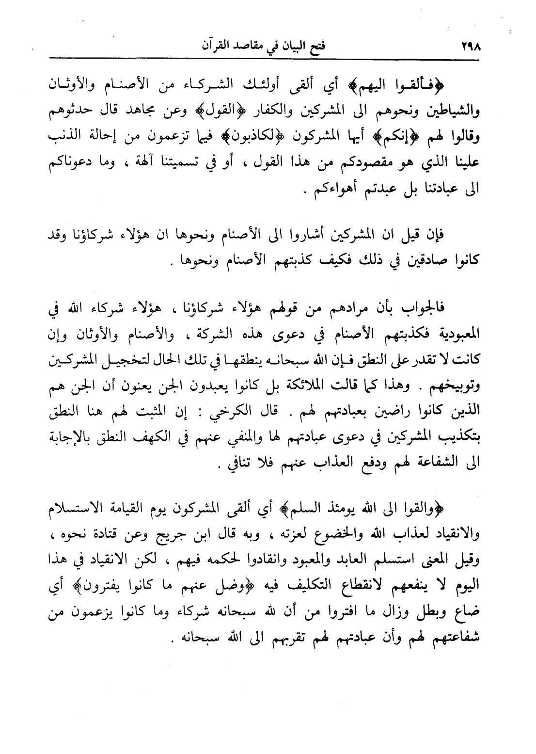 فالجواب بأن مرادهم من قولهم هؤلاء شركاؤنا، هؤلاء شركاء الله في المعبودية فكذبتهم الأصنام في دعوى هذه الشركة، والأصنام والأوثان وإن كانت لا تقدر على النطق فإن الله سبحانه ينطقها في تلك الحال لتخجيل المشركين وتوبيخهم. وهذا كما قالت الملائكة بل كانوا يعبدون الجن يعنون أن الجن هم الذين كانوا راضين بعبادتهم لهم. قال الكرخي: أن المثبت لهم هنا النطق بتكذيب المشركين في دعوى عبادتهم لها والمنفي عنهم في الكهف النطق بالإجابة إلى الشفاعة لهم ودفع العذاب عنهم فلا تنافي.