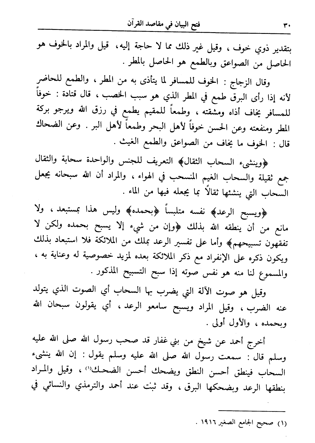(ويسبح الرعد) نفسه متلبساً (بحمده) وليس هذا بمستبعد، ولا مانع من أن ينطقه الله بذلك (وإن من شيء إلا يسبح بحمده ولكن لا تفقهون تسبيحهم) وأما على تفسير الرعد بملك من الملائكة فلا استبعاد بذلك ويكون ذكره على الإنفراد مع ذكر الملائكة بعده لزيد خصوصية له وعناية به، والمسموع لنا منه هو نفس صوته إذا سبح التسبيح المذكور.