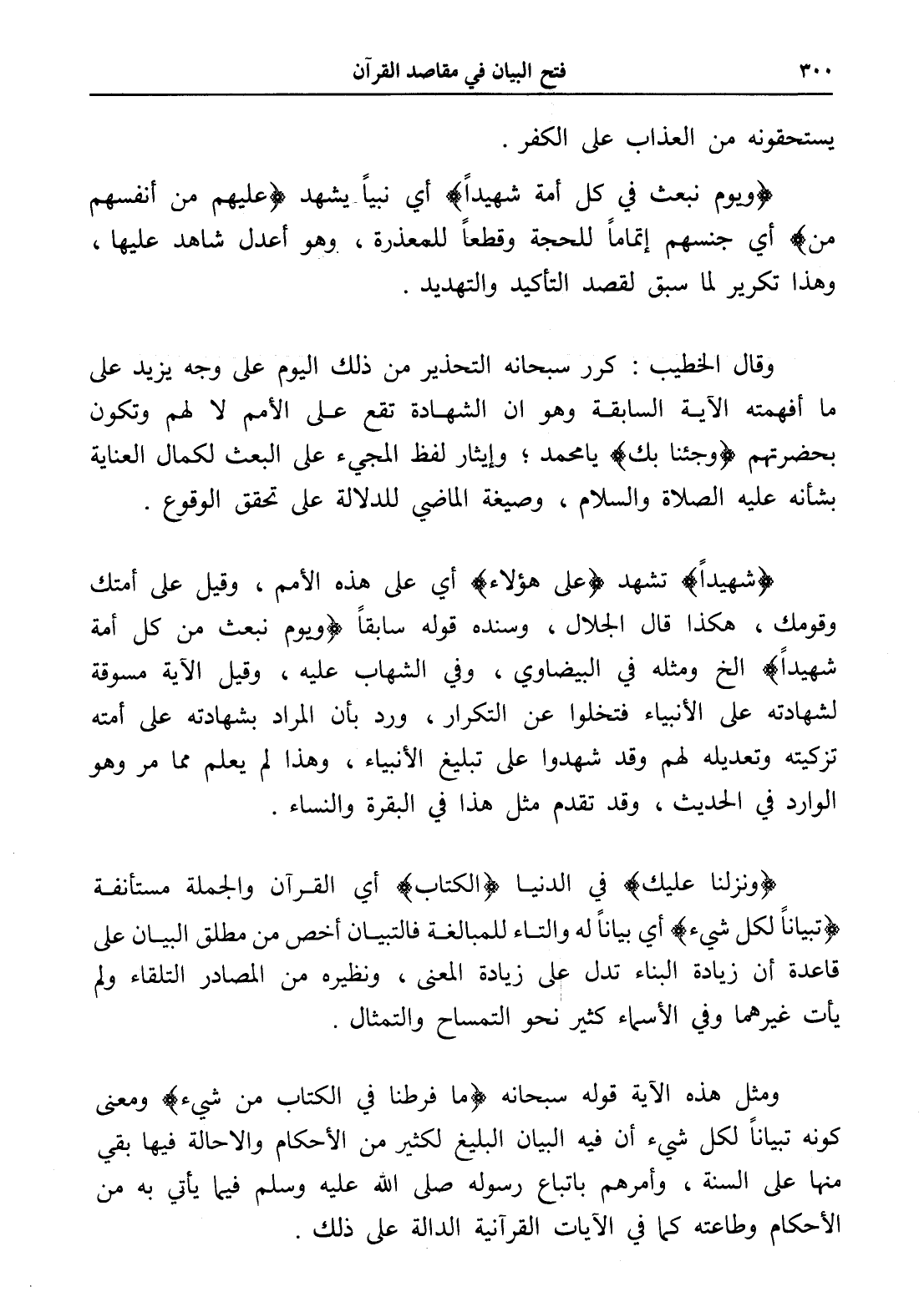 ومثل هذه الآية قوله سبحانه (ما فرطنا في الكتاب من شيء) ومعنى كونه تبياناً لكل شيء أن فيه البيان البليغ لكثير من الأحكام والإحالة فيها بقي منها على السنة، وأمرهم باتباع رسوله صلى الله عليه وسلم فيما يأتي به من الأحكام وطاعته كما في الآيات القرآنية الدالة على ذلك.