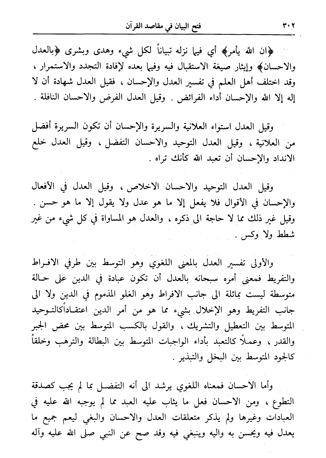 ْوالأولى تفسير العدل بالمعنى اللغوي وهو التوسط بين طرفي الإفراط والتفريط فمعنى أمره سبحانه بالعدل أن تكون عبادة في الدين على حالة متوسطة ليست بمائلة إلى جانب الإفراط وهو الغلو المذموم في الدين ولا إلى جانب التفريط وهو الإخلال بشيء مما هو من أمر الدين اعتقاداً كالتوحيد المتوسط بين التعطيل والتشريك، والقول بالكسب المتوسط بين محض الجبر والقدر، وعملاً كالتعبد بأداء الواجبات المتوسط بين البطالة والترهب وخلقاً كالجود المتوسط بين البخل والتبذير.
