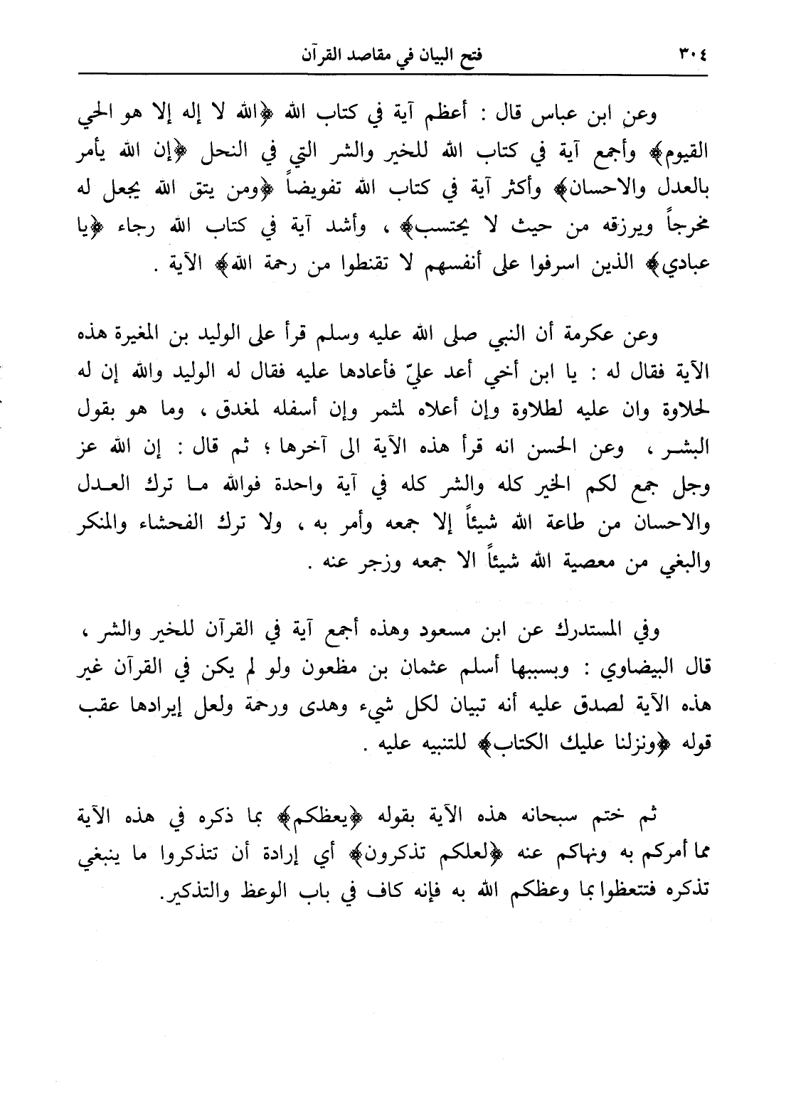 وعن ابن عباس قال: أعظم آية في كتاب الله (الله لا إله إلا هو الحي القيوم) وأجمع آية في كتاب الله للخير والشر التي في النحل (إن الله يأمر بالعدل والإحسان) وأكثر آية في كتاب الله تفويضاً (ومن يتق الله يجعل له مخرجاً ويرزقه من حيث لا يحتسب)، وأشد آية في كتاب الله رجاء (يا عبادي) الذين أسرفوا على أنفسهم لا تقنطوا من رحمة الله) الآية.