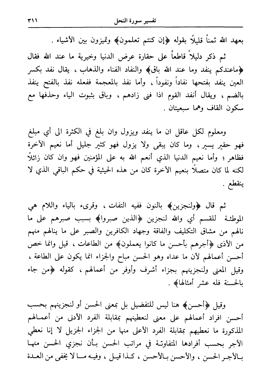 (ما عندكم ينفد وما عند الله باق) والنفاد الفناء والذهاب، يقال نفد بكسر العين ينفد بفتحها نفاداً ونفوداً، وأما نفذ بالمعجمة ففعله نفذ بالفتح ينفذ بالضم، ويقال أنفد القوم إذا فنى زادهم، وباق بثبوت الياء وحذفها مع سكون القاف وهما سبعيتان.