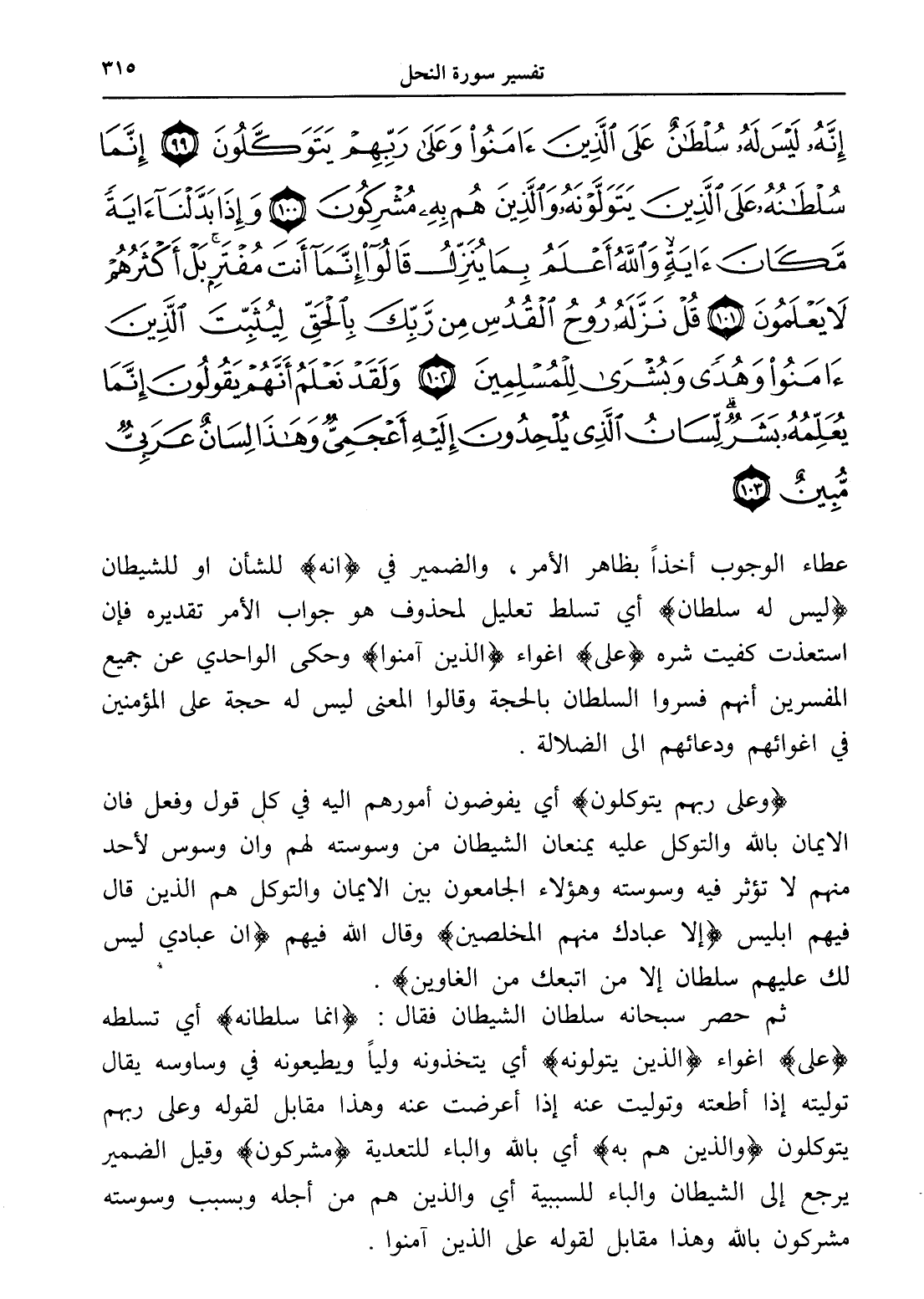 إِنَّهُ لَيْسَ لَهُ سُلْطَانٌ عَلَى الَّذِينَ آمَنُوا وَعَلَى رَبِّهِمْ يَتَوَكَّلُونَ (99) إِنَّمَا سُلْطَانُهُ عَلَى الَّذِينَ يَتَوَلَّوْنَهُ وَالَّذِينَ هُمْ بِهِ مُشْرِكُونَ (100) وَإِذَا بَدَّلْنَا آيَةً مَكَانَ آيَةٍ وَاللَّهُ أَعْلَمُ بِمَا يُنَزِّلُ قَالُوا إِنَّمَا أَنْتَ مُفْتَرٍ بَلْ أَكْثَرُهُمْ لَا يَعْلَمُونَ (101) قُلْ نَزَّلَهُ رُوحُ الْقُدُسِ مِنْ رَبِّكَ بِالْحَقِّ لِيُثَبِّتَ الَّذِينَ آمَنُوا وَهُدًى وَبُشْرَى لِلْمُسْلِمِينَ (102) وَلَقَدْ نَعْلَمُ أَنَّهُمْ يَقُولُونَ إِنَّمَا يُعَلِّمُهُ بَشَرٌ لِسَانُ الَّذِي يُلْحِدُونَ إِلَيْهِ أَعْجَمِيٌّ وَهَذَا لِسَانٌ عَرَبِيٌّ مُبِينٌ (103)