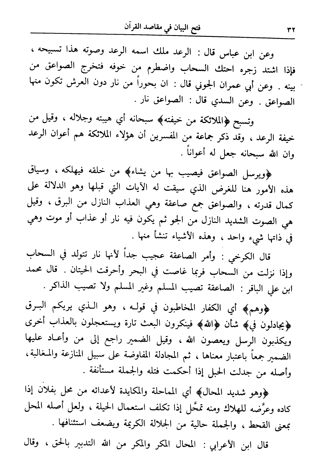 وعن ابن عباس قال: الرعد ملك اسمه الرعد وصوته هذا تسبيحه، فإذا اشتد زجره احتك السحاب واضطرم من خوفه فتخرج الصواعق من بينه. وعن أبي عمران الجوني قال: أن بحوراً من نار دون العرش تكون منها الصواعق. وعن السدي قال: الصواعق نار.