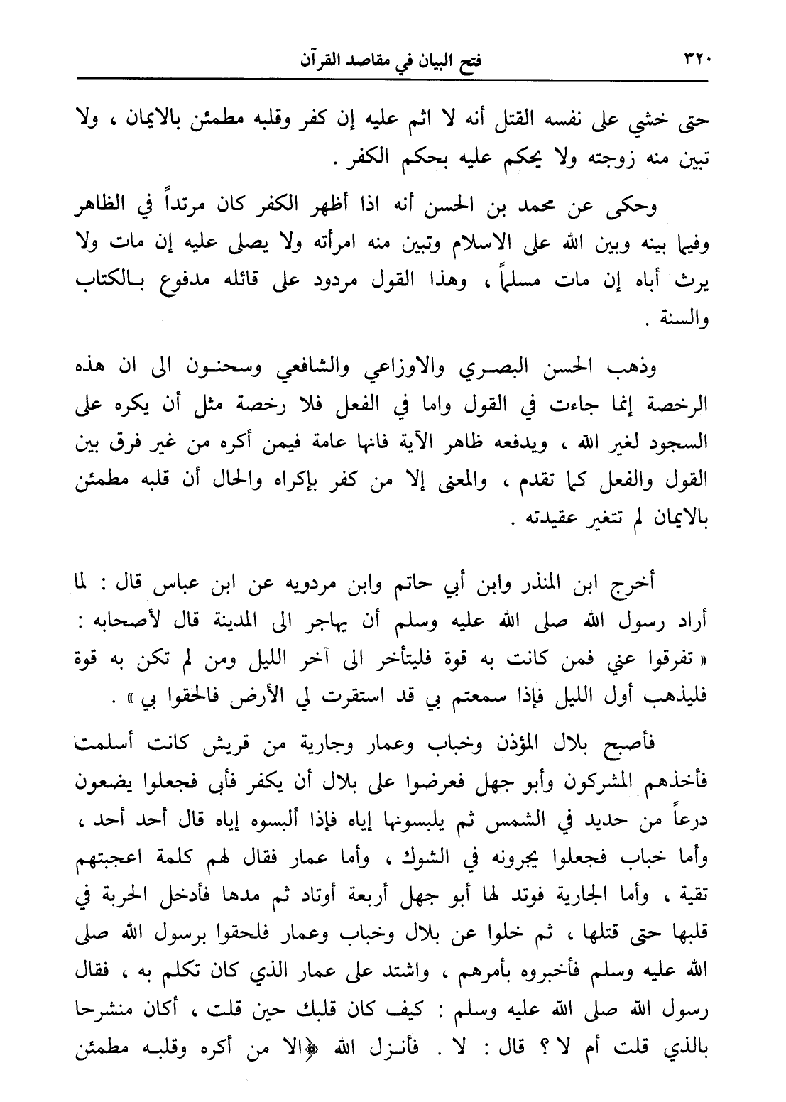 فأصبح بلال المؤذن وخباب وعمار وجارية من قريش كانت أسلمت فأخذهم المشركون وأبو جهل فعرضوا على بلال أن يكفر فأبى فجعلوا يضعون درعاً من حديد في الشمس ثم يلبسونها إياه فإذا ألبسوه إياه قال أحد أحد، وأما خباب فجعلوا يجرونه في الشوك، وأما عمار فقال لهم كلمة أعجبتهم تقية، وأما الجارية فوتد لها أبو جهل أربعة أوتاد ثم مدها فأدخل الحربة في قلبها حتى قتلها، ثم خلوا عن بلال وخباب وعمار فلحقوا برسول الله صلى الله عليه وسلم فأخبروه بأمرهم، واشتد على عمار الذي كان تكلم به، فقال رسول الله صلى الله عليه وسلم: " كيف كان قلبك حين قلت، أكان منشرحا بالذي قلت أم لا؟ " قال: لا. فأنزل الله (إلا من أكره وقلبه مطمئن