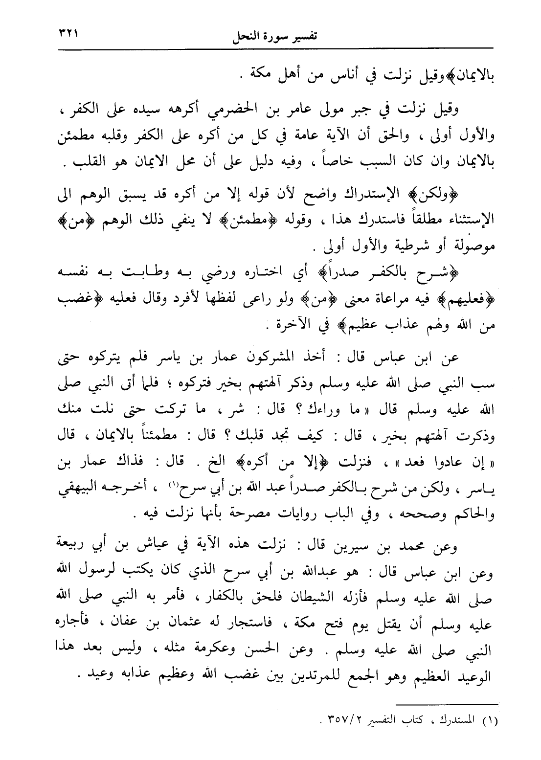 عن ابن عباس قال: أخذ المشركون عمار بن ياسر فلم يتركوه حتى سب النبي صلى الله عليه وسلم وذكر آلهتهم بخير فتركوه، فلما أتى النبي صلى الله عليه وسلم قال " ما وراءك؟ " قال: شر، ما تركت حتى نلت منك وذكرت آلهتهم بخير، قال: " كيف تجد قلبك؟ " قال: مطمئناً بالإيمان، قال " إن عادوا فعد "، فنزلت (إلا من أكره) الخ. قال: فذاك عمار بن ياسر، ولكن من شرح بالكفر صدراً عبد الله بن أبي سرح (¬1)، أخرجه البيهقي والحاكم وصححه، وفي الباب روايات مصرحة بأنها نزلت فيه.