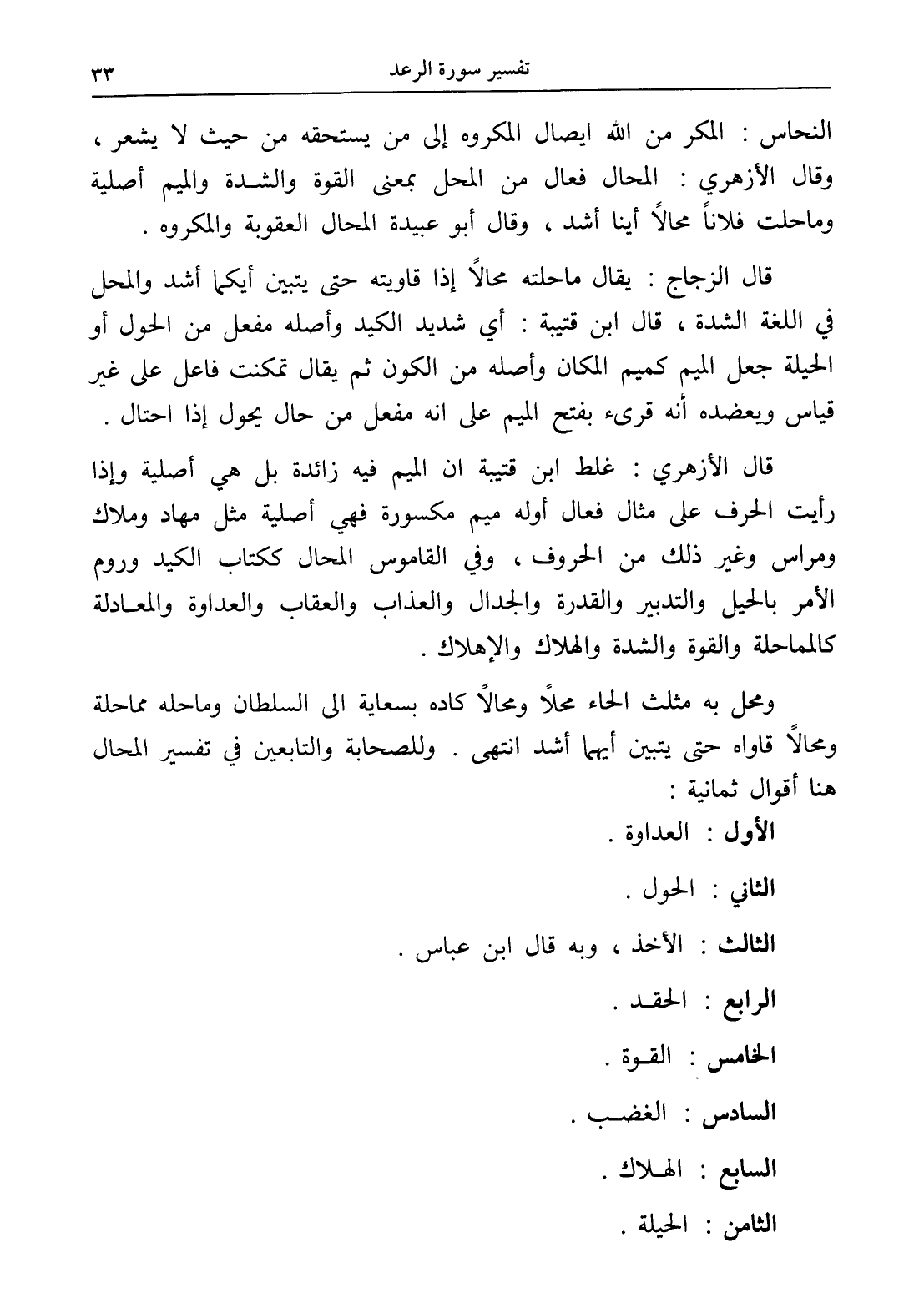 ومحل به مثلث الحاء محلاً ومحالاً كاده بسعاية إلى السلطان وماحله مماحلة ومحالاً قاواه حتى يتبين أيهما أشد انتهى. وللصحابة والتابعين في تفسير المحال هنا أقوال ثمانية: