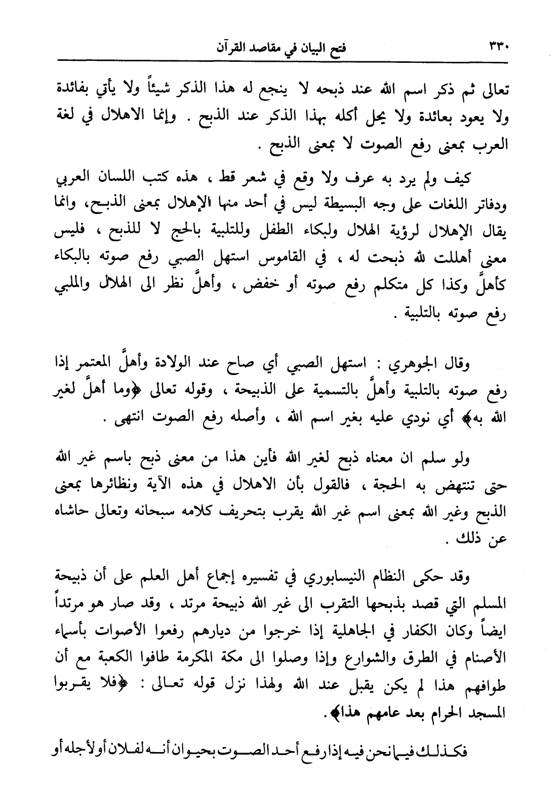 كيف ولم يرد به عرف ولا وقع في شعر قط، هذه كتب اللسان العربي ودفاتر اللغات على وجه البسيطة ليس في أحد منها الإهلال بمعنى الذبح، وإنما يقال الإهلال لرؤية الهلال ولبكاء الطفل وللتلبية بالحج لا للذبح، فليس معنى أهللت لله ذبحت له، في القاموس استهل الصبي رفع صوته بالبكاء كأهلَّ وكذا كل متكلم رفع صوته أو خفض، وأهلَّ نظر إلى الهلال والملبي رفع صوته بالتلبية.