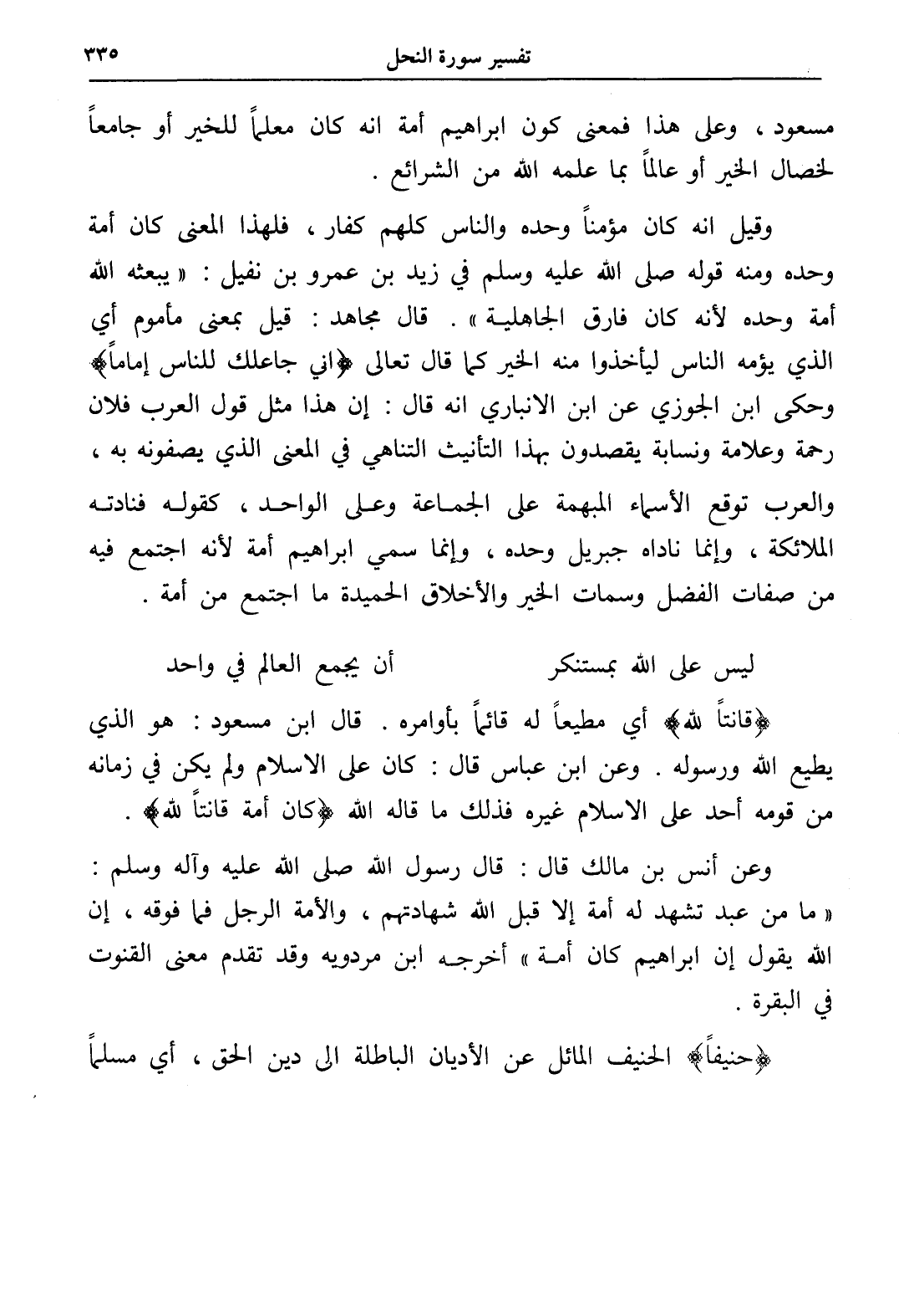 وقيل أنه كان مؤمناً وحده والناس كلهم كفار، فلهذا المعنى كان أمة وحده ومنه قوله صلى الله عليه وسلم في زيد بن عمرو بن نفيل: " يبعثه الله أمة وحده لأنه كان فارق الجاهلية ". قال مجاهد: قيل بمعنى مأموم أي الذي يؤمه الناس ليأخذوا منه الخير كما قال تعالى (إني جاعلك للناس إماماً). وحكى ابن الجوزي عن ابن الأنباري أنه قال: أن هذا مثل قول العرب فلان رحمة وعلامة ونسابة يقصدون بهذا التأنيث التناهي في المعنى الذي يصفونه به، والعرب توقع الأسماء المبهمة على الجماعة وعلى الواحد، كقوله فنادته الملائكة، وإنما ناداه جبريل وحده، وإنما سمي إبراهيم أمة لأنه اجتمع فيه من صفات الفضل وسمات الخير والأخلاق الحميدة ما اجتمع من أمة.