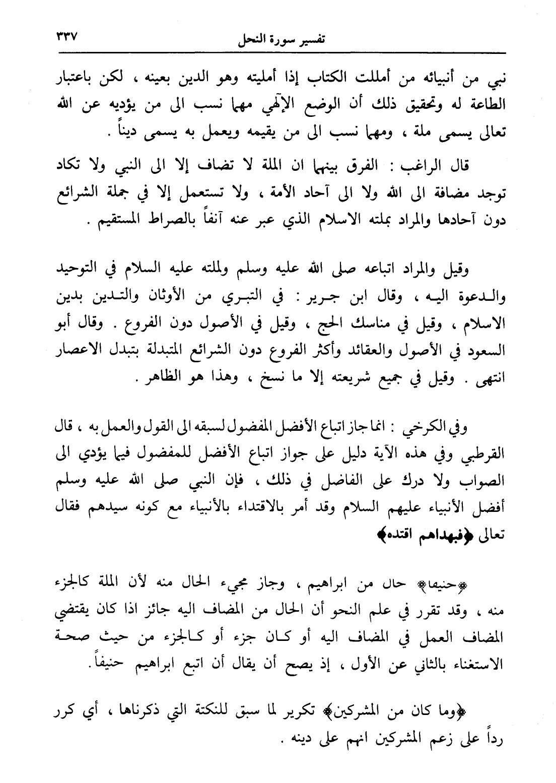 (حنيفا) حال من إبراهيم، وجاز مجيء الحال منه لأن الملة كالجزء منه، وقد تقرر في علم النحو أن الحال من المضاف إليه جائز إذا كان يقتضي المضاف العمل في المضاف إليه أو كان جزء أو كالجزء من حيث صحة الاستغناء بالثاني عن الأول، إذ يصح أن يقال أن اتبع إبراهيم حنيفاً.