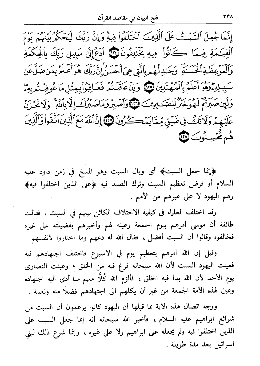 إِنَّمَا جُعِلَ السَّبْتُ عَلَى الَّذِينَ اخْتَلَفُوا فِيهِ وَإِنَّ رَبَّكَ لَيَحْكُمُ بَيْنَهُمْ يَوْمَ الْقِيَامَةِ فِيمَا كَانُوا فِيهِ يَخْتَلِفُونَ (124) ادْعُ إِلَى سَبِيلِ رَبِّكَ بِالْحِكْمَةِ وَالْمَوْعِظَةِ الْحَسَنَةِ وَجَادِلْهُمْ بِالَّتِي هِيَ أَحْسَنُ إِنَّ رَبَّكَ هُوَ أَعْلَمُ بِمَنْ ضَلَّ عَنْ سَبِيلِهِ وَهُوَ أَعْلَمُ بِالْمُهْتَدِينَ (125) وَإِنْ عَاقَبْتُمْ فَعَاقِبُوا بِمِثْلِ مَا عُوقِبْتُمْ بِهِ وَلَئِنْ صَبَرْتُمْ لَهُوَ خَيْرٌ لِلصَّابِرِينَ (126) وَاصْبِرْ وَمَا صَبْرُكَ إِلَّا بِاللَّهِ وَلَا تَحْزَنْ عَلَيْهِمْ وَلَا تَكُ فِي ضَيْقٍ مِمَّا يَمْكُرُونَ (127) إِنَّ اللَّهَ مَعَ الَّذِينَ اتَّقَوْا وَالَّذِينَ هُمْ مُحْسِنُونَ (128)