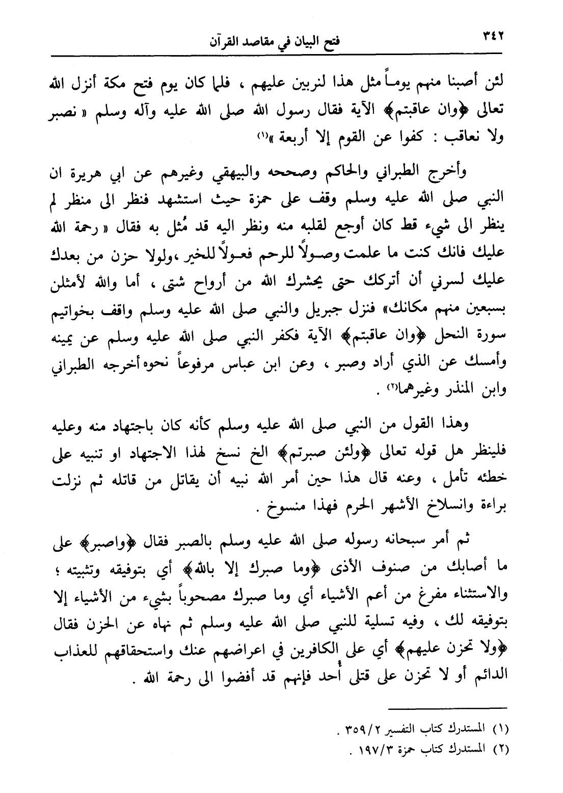 وأخرج الطبراني والحاكم وصححه والبيهقي وغيرهم عن أبي هريرة أن النبي صلى الله عليه وسلم وقف على حمزة حيث استشهد فنظر إلى منظر لم ينظر إلى شيء قط كان أوجع لقلبه منه ونظر إليه قد مثل به فقال " رحمة الله عليك فإنك كنت ما علمت وصولاً للرحم فعولاً للخير، ولولا حزن من بعدك عليك لسرني أن أتركك حتى يحشرك الله من أرواح شتى، أما والله لأمثلن بسبعين منهم مكانك " فنزل جبريل والنبي صلى الله عليه وسلم واقف بخواتيم سورة النحل (وإن عاقبتم) الآية فكفر النبي صلى الله عليه وسلم عن يمينه وأمسك عن الذي أراد وصبر، وعن ابن عباس مرفوعاً نحوه أخرجه الطبراني وابن المنذر وغيرهما (¬2).
