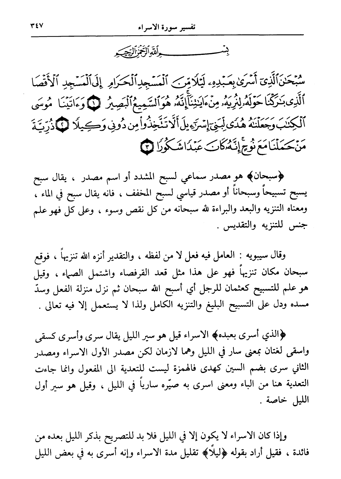(الذي أسرى بعبده) الإسراء قيل هو سير الليل يقال سرى وأسرى كسقى وأسقى لغتان بمعنى سار في الليل وهما لازمان لكن مصدر الأول الإسراء ومصدر الثاني سرى بضم السين كهدى فالهمزة ليست للتعدية إلى المفعول وإنما جاءت التعدية هنا من الباء ومعنى أسرى به صيّره سارياً في الليل، وقيل هو سير أول الليل خاصة.