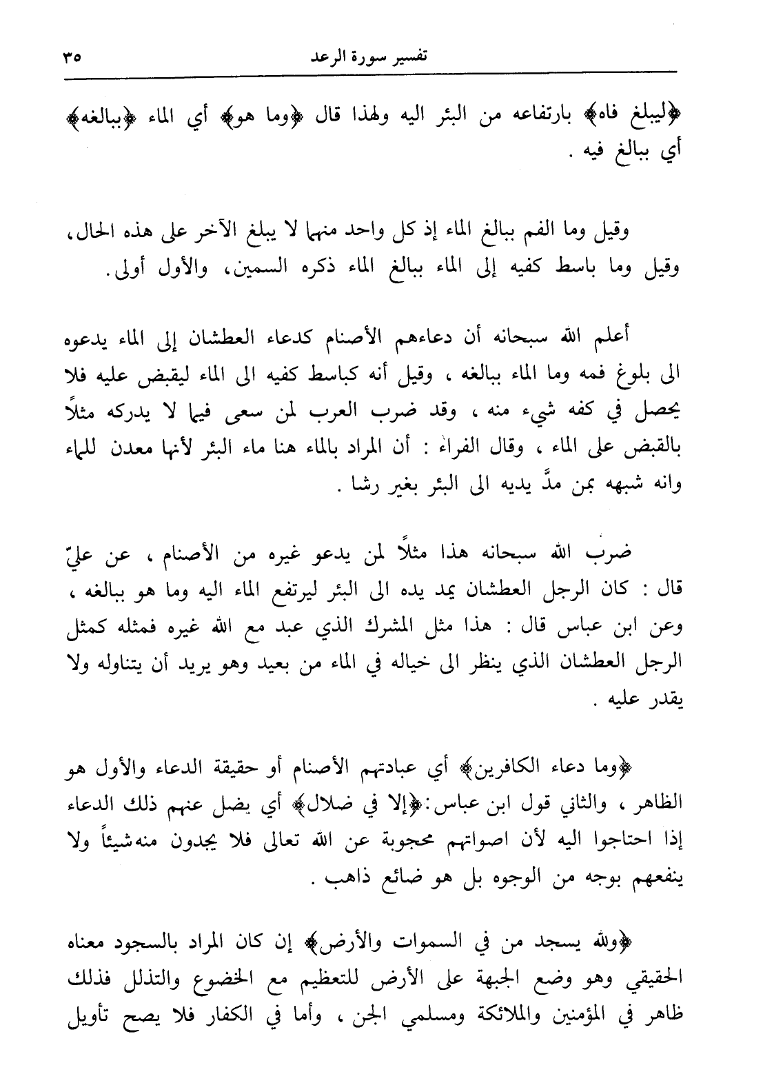 ضرب الله سبحانه هذا مثلاً لمن يدعو غيره من الأصنام، عن عليّ قال: كان الرجل العطشان يمد يده إلى البئر ليرتفع الماء إليه وما هو ببالغه، وعن ابن عباس قال: هذا مثل المشرك الذي عبد مع الله غيره فمثله كمثل الرجل العطشان الذي ينظر إلى خياله في الماء من بعيد وهو يريد أن يتناوله ولا يقدر عليه.