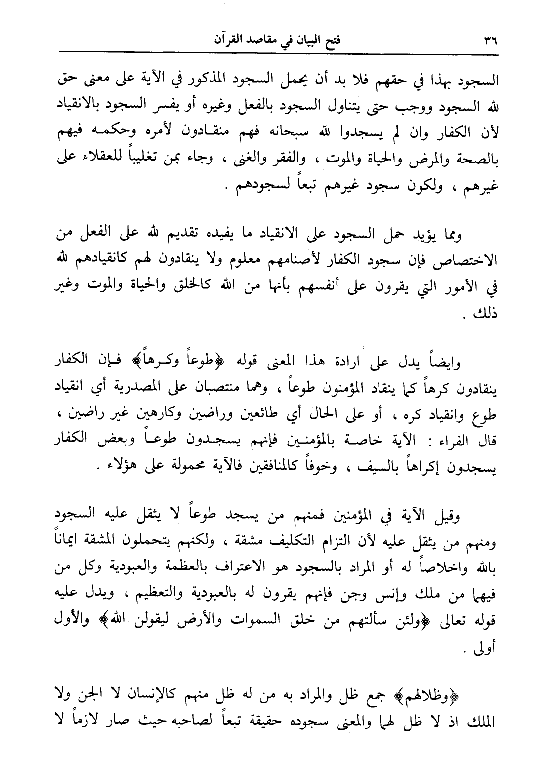 وقيل الآية في المؤمنين فمنهم من يسجد طوعاً لا يثقل عليه السجود ومنهم من يثقل عليه لأن التزام التكليف مشقة، ولكنهم يتحملون المشقة إيماناً بالله وإخلاصاً له أو المراد بالسجود هو الاعتراف بالعظمة والعبودية وكل من فيهما من ملك وإنس وجن فإنهم يقرون له بالعبودية والتعظيم، ويدل عليه قوله تعالى (ولئن سألتهم من خلق السماوات والأرض ليقولن الله) والأول أولى.