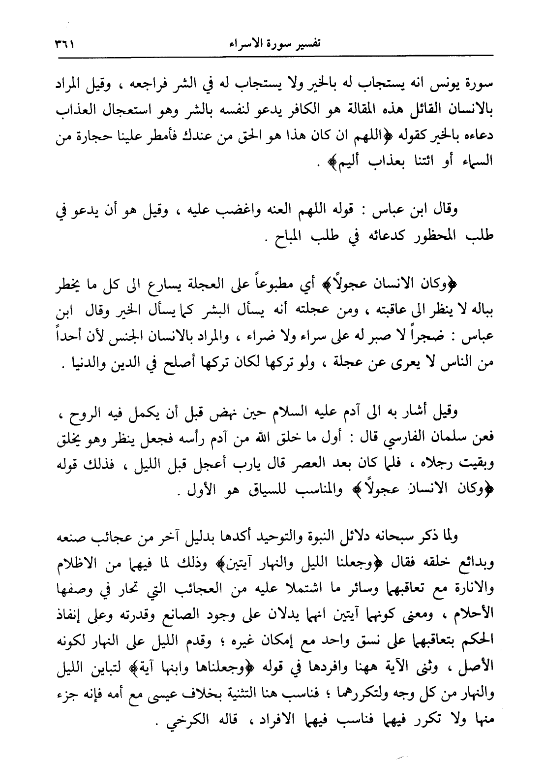 (وكان الإنسان عجولاً) أي مطبوعاً على العجلة يسارع إلى كل ما يخطر بباله لا ينظر إلى عاقبته، ومن عجلته أنه يسأل البشر كما يسأل الخير وقال ابن عباس: ضجراً لا صبر له على سراء ولا ضراء، والمراد بالإنسان الجنس لأن أحداً من الناس لا يعرى عن عجلة، ولو تركها لكان تركها أصلح في الدين والدنيا.
