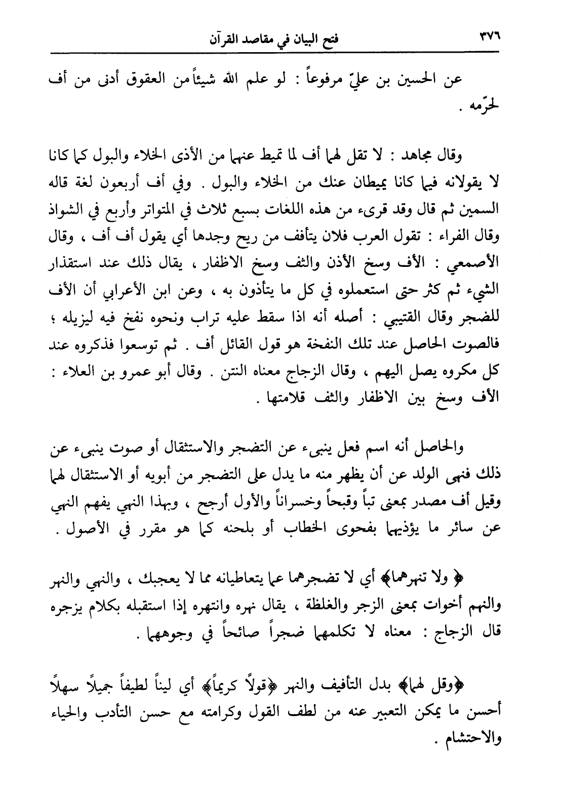 والحاصل أنه اسم فعل ينبئ عن التضجر والاستثقال أو صوت ينبئ عن ذلك فنهى الولد عن أن يظهر منه ما يدل على التضجر من أبويه أو الاستثقال لهما وقيل أف مصدر بمعنى تباً وقبحاً وخسراناً والأول أرجح، وبهذا النهي يفهم النهي عن سائر ما يؤذيهما بفحوى الخطاب أو بلحنه كما هو مقرر في الأصول.