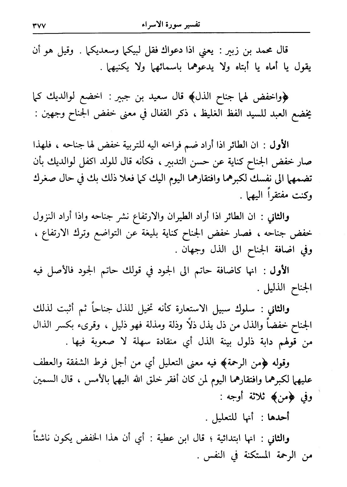والثاني: أن الطائر إذا أراد الطيران والارتفاع نشر جناحه وإذا أراد النزول خفض جناحه، فصار خفض الجناح كناية بليغة عن التواضع وترك الارتفاع، وفي إضافة الجناح إلى الذل وجهان.
