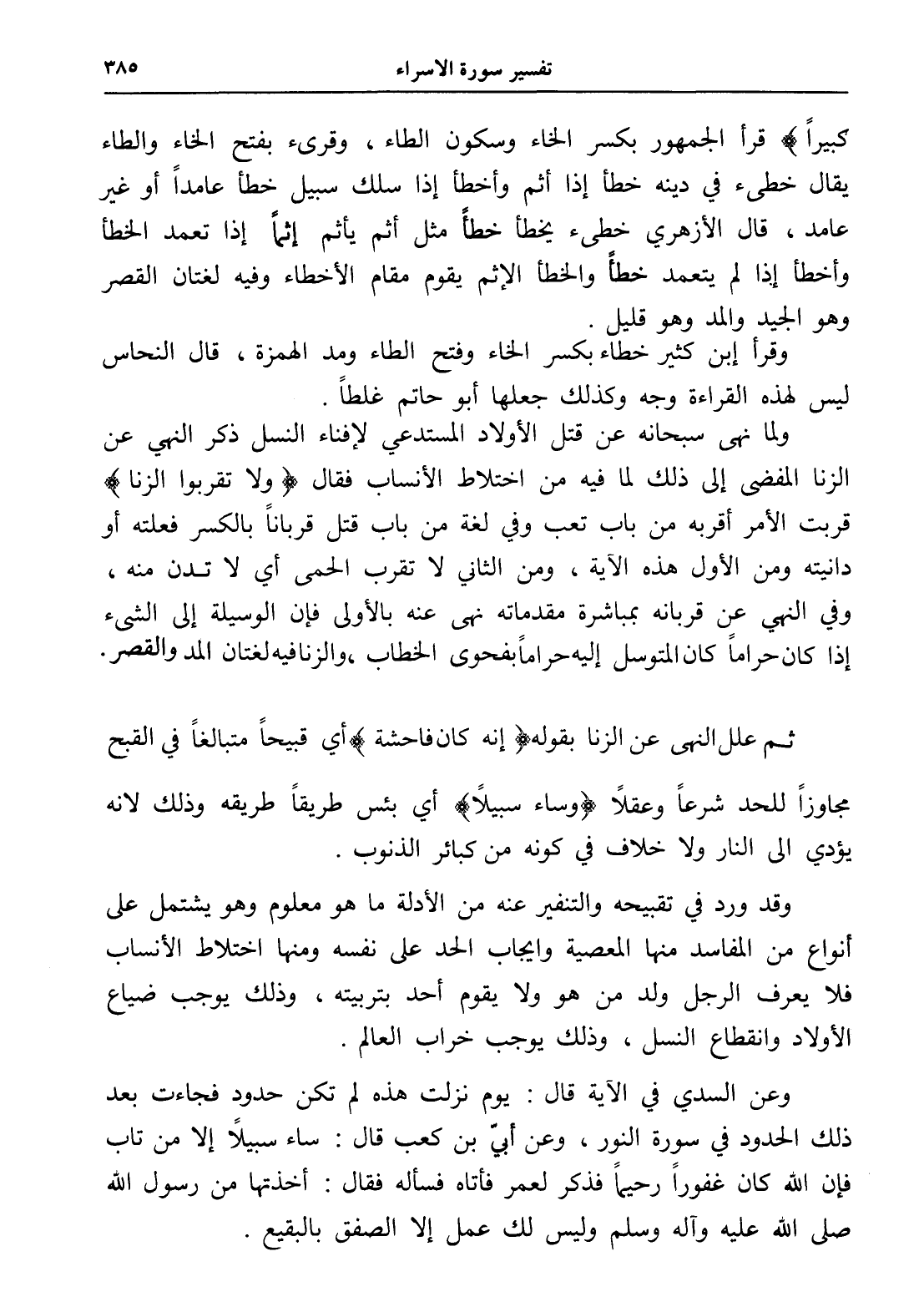 (ولا تقربوا الزنا) قربت الأمر أقربه من باب تعب وفي لغة من باب قتل قرباناً بالكسر فعلته أو دانيته ومن الأول هذه الآية، ومن الثاني لا تقرب الحمى أي لا تدن منه، وفي النهي عن قربانه بمباشرة مقدماته نهى عنه بالأولى فإن الوسيلة إلى الشيء إذا كان حراماً كان المتوسل إليه حراماً بفحوى الخطاب، والزنافيه لغتان المد والقصر.