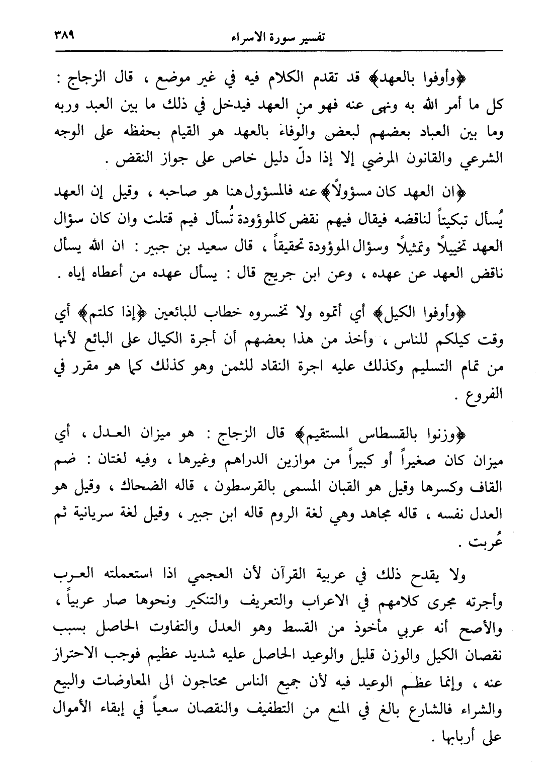 (وزنوا بالقسطاس المستقيم) قال الزجاج: هو ميزان العدل، أي ميزان كان صغيراً أو كبيراً من موازين الدراهم وغيرها، وفيه لغتان: ضم القاف وكسرها وقيل هو القبان المسمى بالقرسطون، قاله الضحاك، وقيل هو العدل نفسه، قاله مجاهد وهي لغة الروم قاله ابن جبير، وقيل لغة سريانية ثم عُربت.