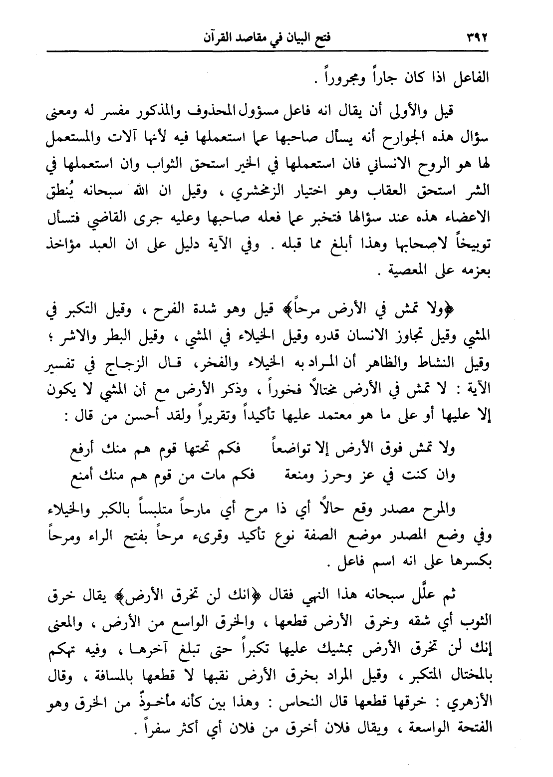 (ولا تمش في الأرض مرحاً) قيل وهو شدة الفرح، وقيل التكبر في المشي وقيل تجاوز الإنسان قدره وقيل الخيلاء في المشي، وقيل البطر والأشر؛ وقيل النشاط والظاهر أن المراد به الخيلاء والفخر، قال الزجاج في تفسير الآية: لا تمش في الأرض مختالاً فخوراً، وذكر الأرض مع أن المشي لا يكون إلا عليها أو على ما هو معتمد عليها تأكيداً وتقريراً ولقد أحسن من قال: