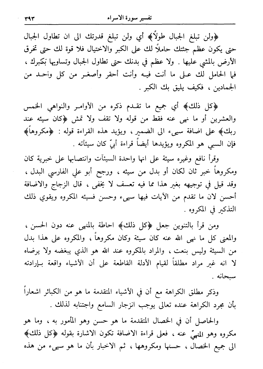 ومن قرأ بالتنوين جعل (كل ذلك) إحاطة بالنهى عنه دون الحسن، والمعنى كل ما نهى الله عنه كان سيئة وكان مكروهاً، والمكروه على هذا بدل من السيئة وليس بنعت، والمراد بالمكروه عند الله هو الذي يبغضه ولا يرضاه لا أنه غير مراد مطلقاً لقيام الأدلة القاطعة على أن الأشياء واقعة بإرادته سبحانه.