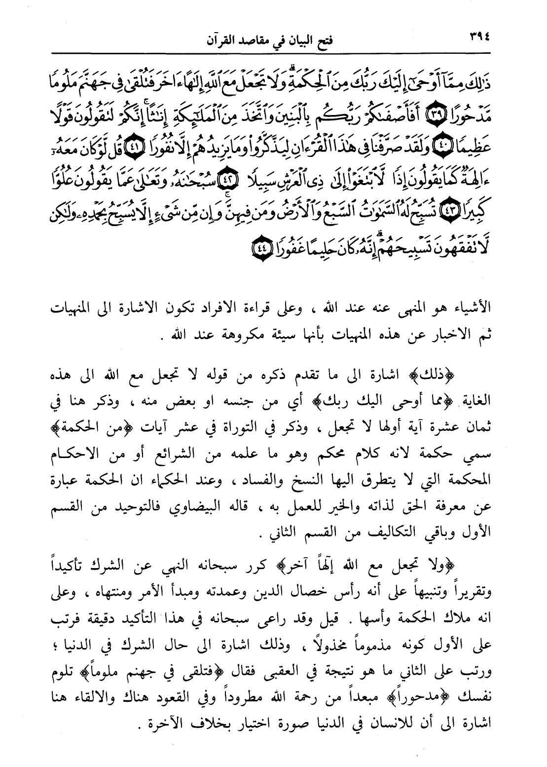 ذَلِكَ مِمَّا أَوْحَى إِلَيْكَ رَبُّكَ مِنَ الْحِكْمَةِ وَلَا تَجْعَلْ مَعَ اللَّهِ إِلَهًا آخَرَ فَتُلْقَى فِي جَهَنَّمَ مَلُومًا مَدْحُورًا (39) أَفَأَصْفَاكُمْ رَبُّكُمْ بِالْبَنِينَ وَاتَّخَذَ مِنَ الْمَلَائِكَةِ إِنَاثًا إِنَّكُمْ لَتَقُولُونَ قَوْلًا عَظِيمًا (40) وَلَقَدْ صَرَّفْنَا فِي هَذَا الْقُرْآنِ لِيَذَّكَّرُوا وَمَا يَزِيدُهُمْ إِلَّا نُفُورًا (41) قُلْ لَوْ كَانَ مَعَهُ آلِهَةٌ كَمَا يَقُولُونَ إِذًا لَابْتَغَوْا إِلَى ذِي الْعَرْشِ سَبِيلًا (42) سُبْحَانَهُ وَتَعَالَى عَمَّا يَقُولُونَ عُلُوًّا كَبِيرًا (43) تُسَبِّحُ لَهُ السَّمَاوَاتُ السَّبْعُ وَالْأَرْضُ وَمَنْ فِيهِنَّ وَإِنْ مِنْ شَيْءٍ إِلَّا يُسَبِّحُ بِحَمْدِهِ وَلَكِنْ لَا تَفْقَهُونَ تَسْبِيحَهُمْ إِنَّهُ كَانَ حَلِيمًا غَفُورًا (44)
